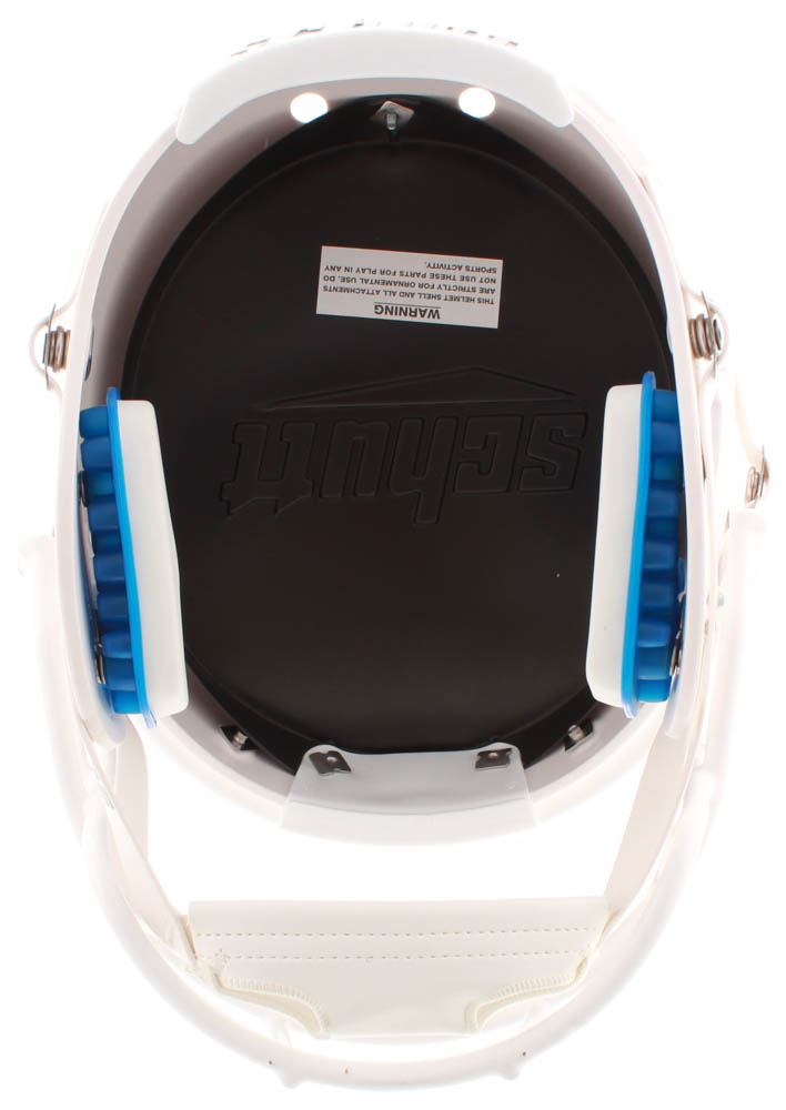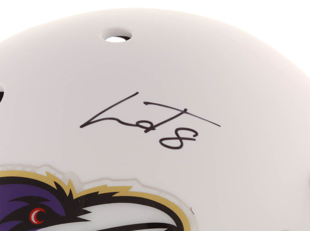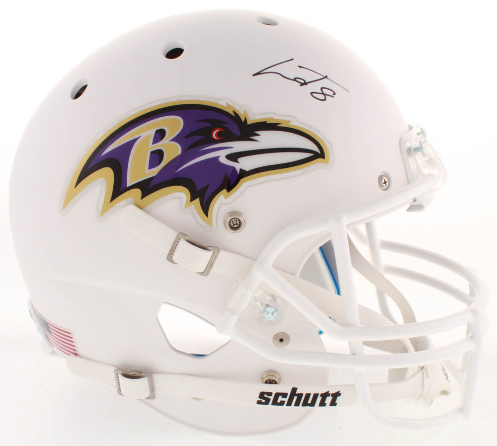 Schutt Baltimore Ravens full-size matte white replica helmet. Hand-signed in black felt-tip pen by Lamar Jackson.
