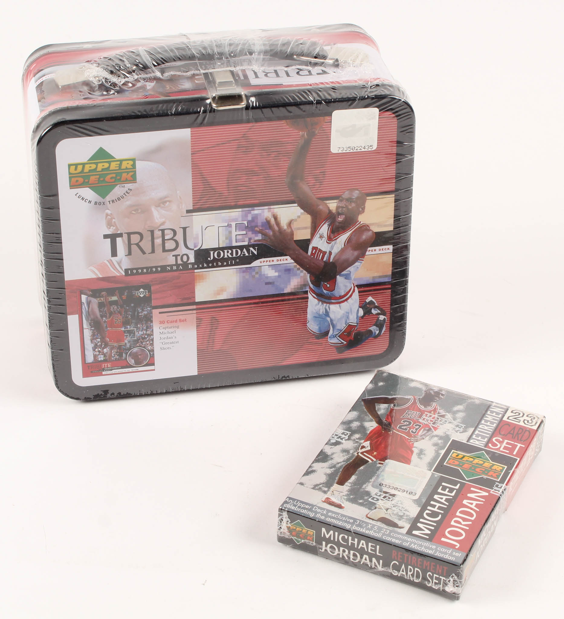 Lot of (2) 1998-99 Upper Deck Michael Jordan Card Sets With NBA Tribute To Michael Jordan Lunch Box (30) & Retirement Commemorative (23)
