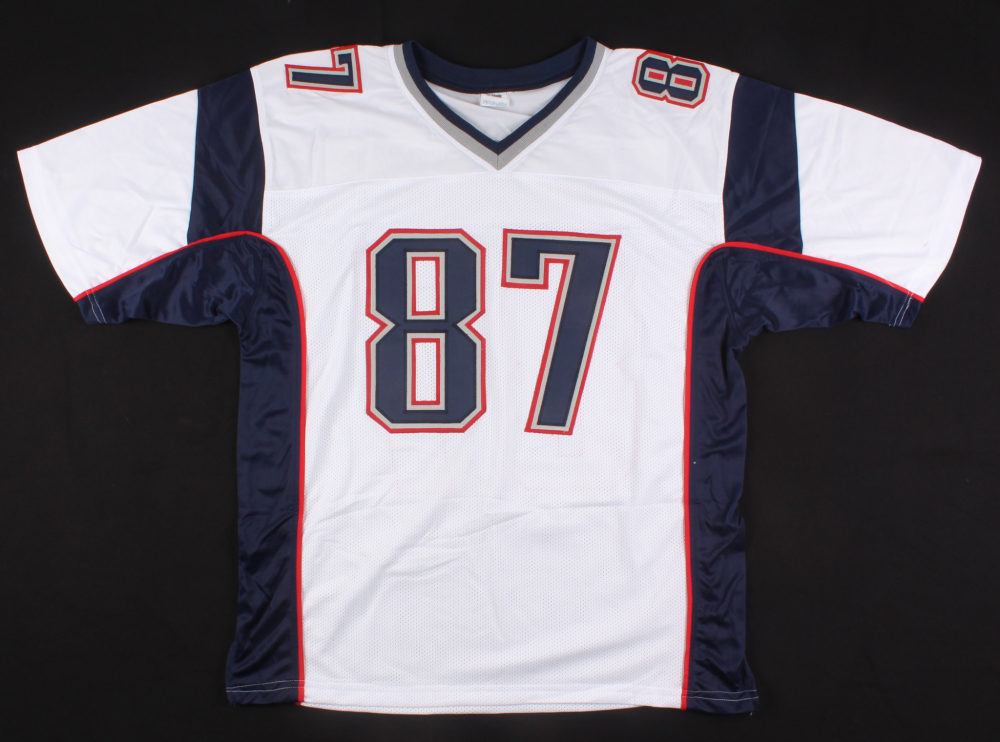 Custom on-field style jersey. Everything is sewn on, size XL. Hand-signed in silver paint pen by Rob Gronkowski.