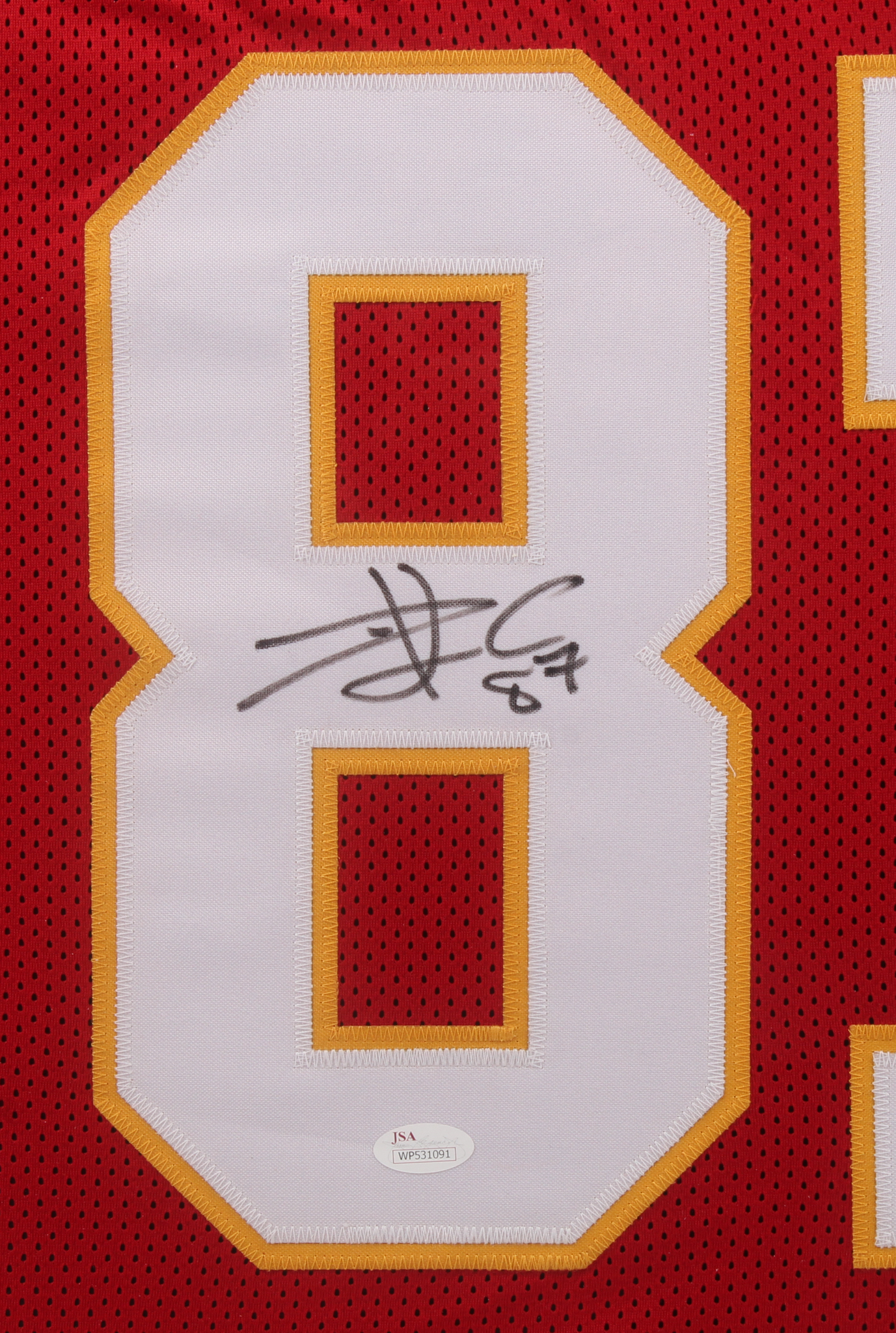 Custom frame measures approximately 35.5" x 43.5" in size and features a jersey which has been hand-signed in black felt tip pen by Travis Kelce.
