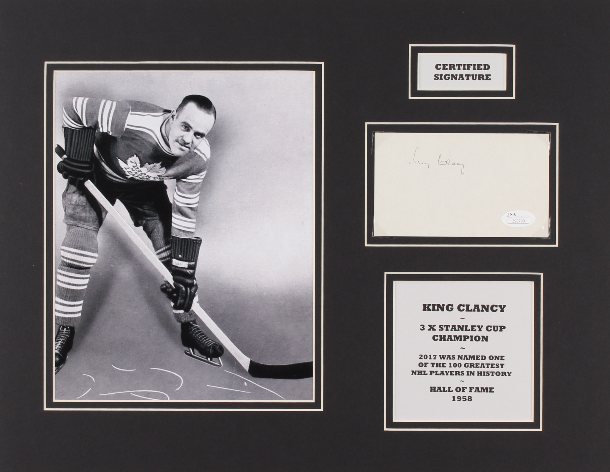 The custom matted display measures 14"x 18" in size and features a 3" x 5" index card that has been hand-signed in black ink pen by King Clancy (D.1986, HOF)