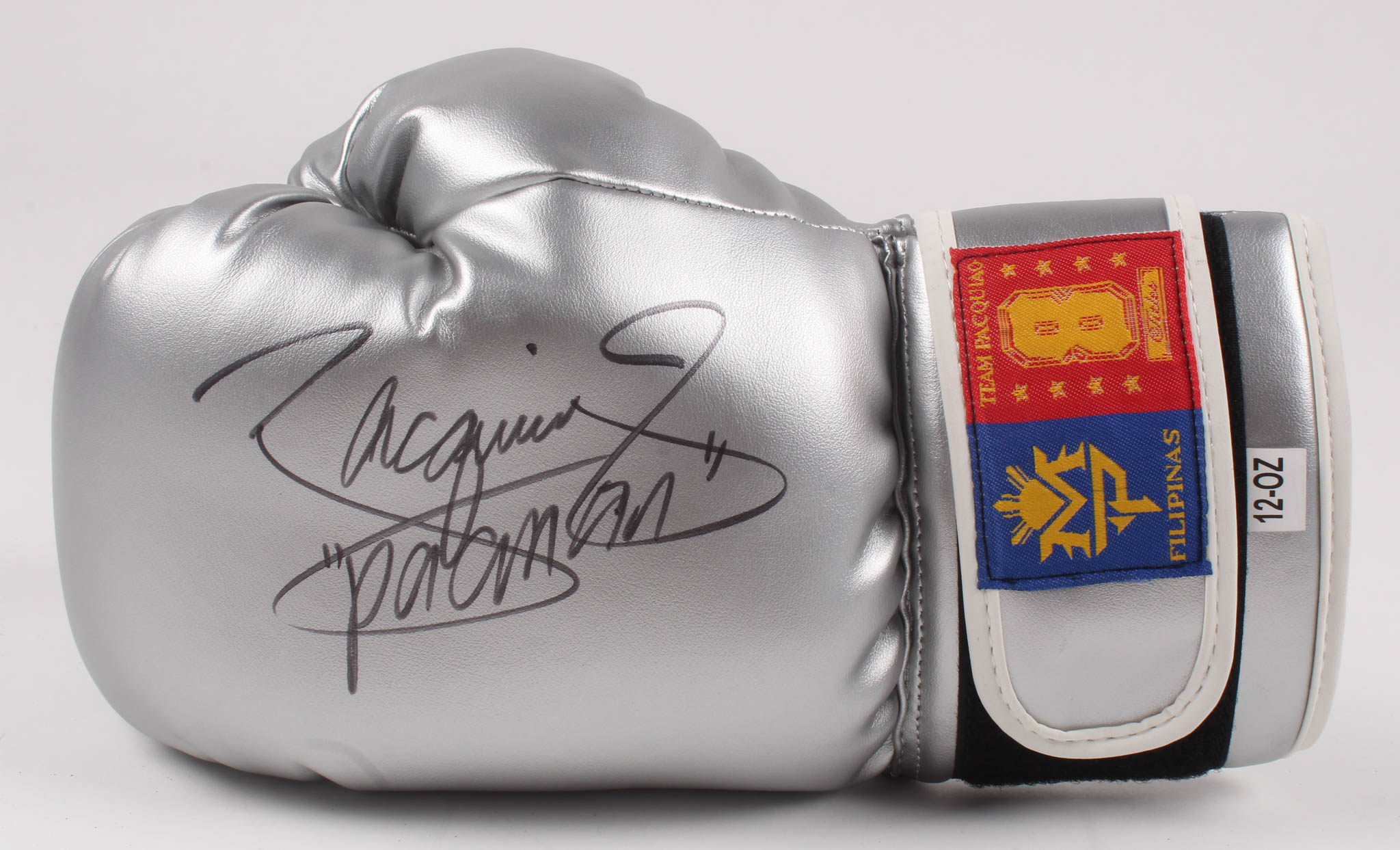Team Pacquiao full-size boxing glove. Hand-signed and inscribed in black felt-tip pen by Manny Pacquiao.