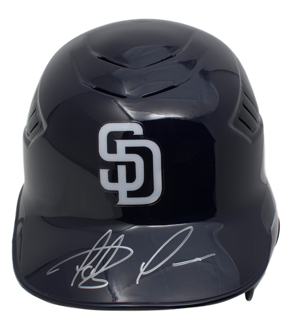 San Diego Padres authentic full-size batting helmet with left ear cover. Hand-signed in silver paint pen by Fernando Tatis Jr.