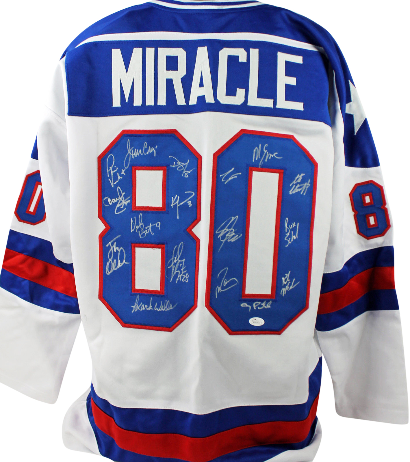 Custom on-ice style jersey. Everything is sewn on, size XL. Hand-signed in silver felt-tip pen by (17) including Steve Janaszak, Jim Craig, Eric Strobel, Ken Morrow, Neil Broten, Phil Verchota, Dave Christian, Jack O'Callaghan, Mark Wills, Mike Eruzione, Steve Christoff, John Harrington, Rob McClannahan, Craig Patrick, Mike Ramsey, Buzz Schneider, and Dave Silk.