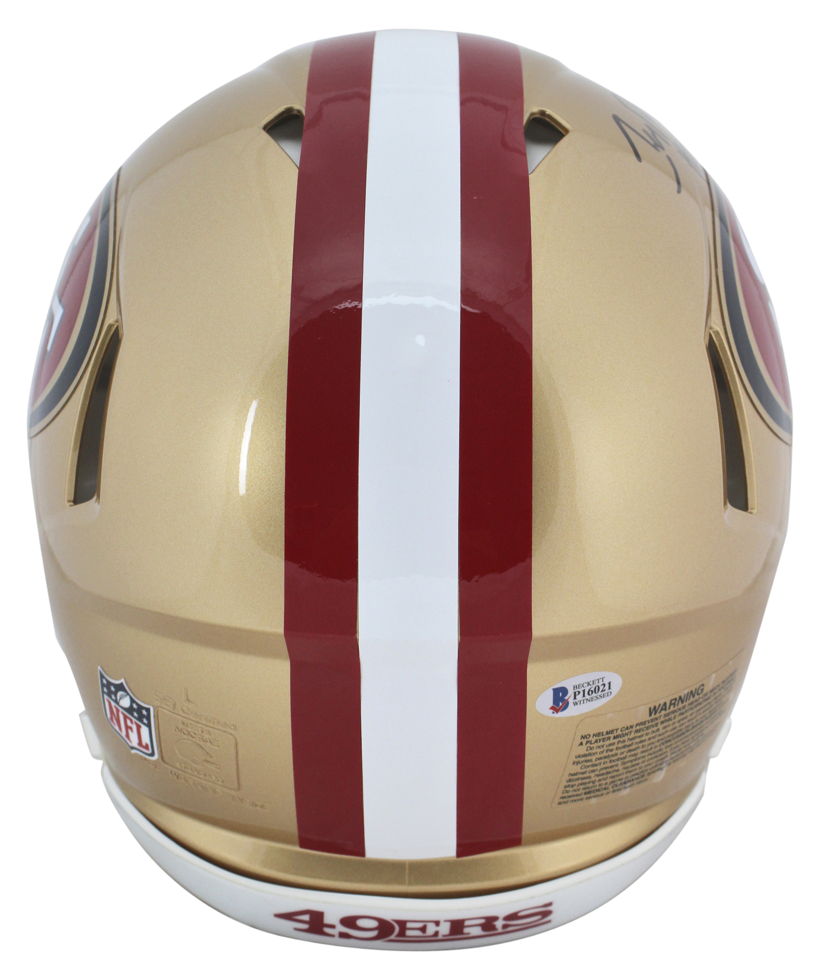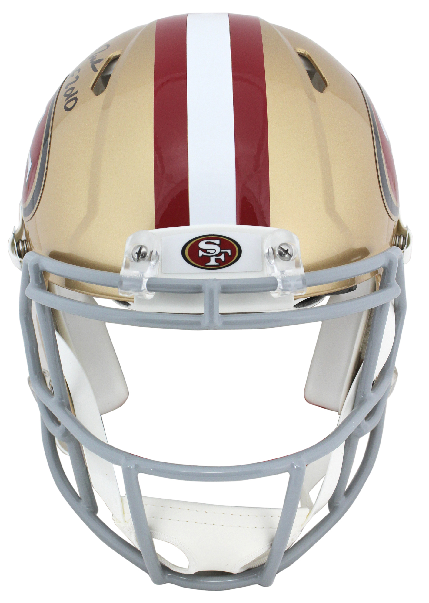 Riddell San Francisco 49ers full-size authentic on-field Speed helmet. Hand-signed and inscribed in black felt-tip pen by Jerry Rice (HOF).
