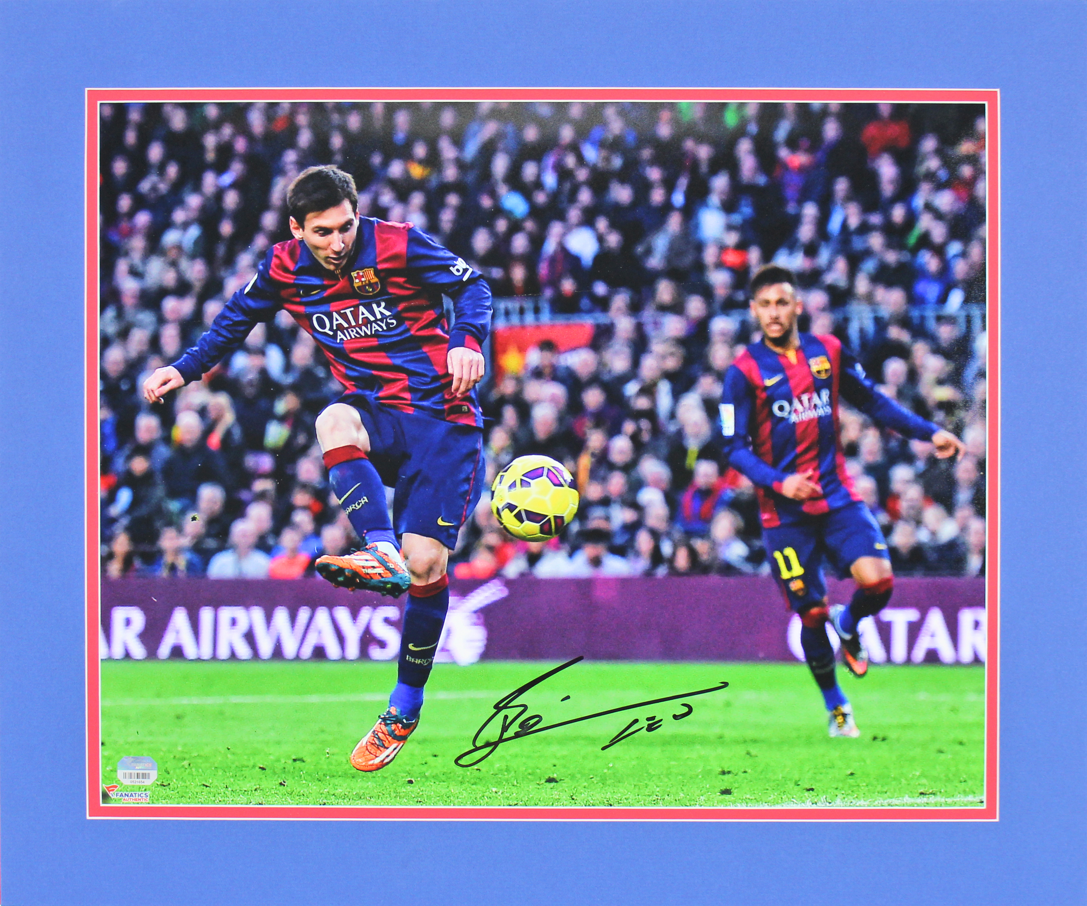 Custom matted display measures approximately 20" x 24" in size and has been hand-signed in black felt-tip pen by Lionel Messi.