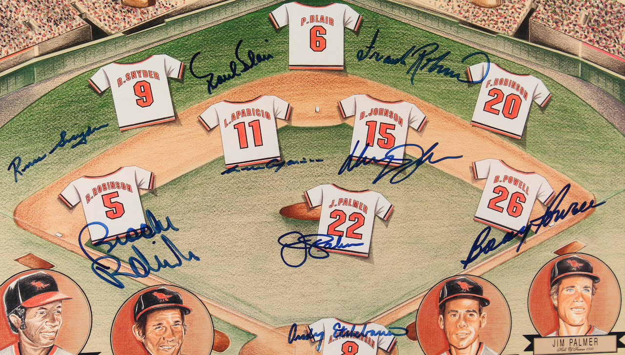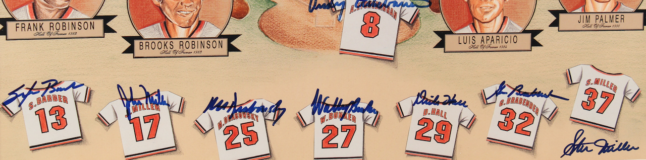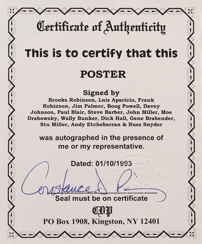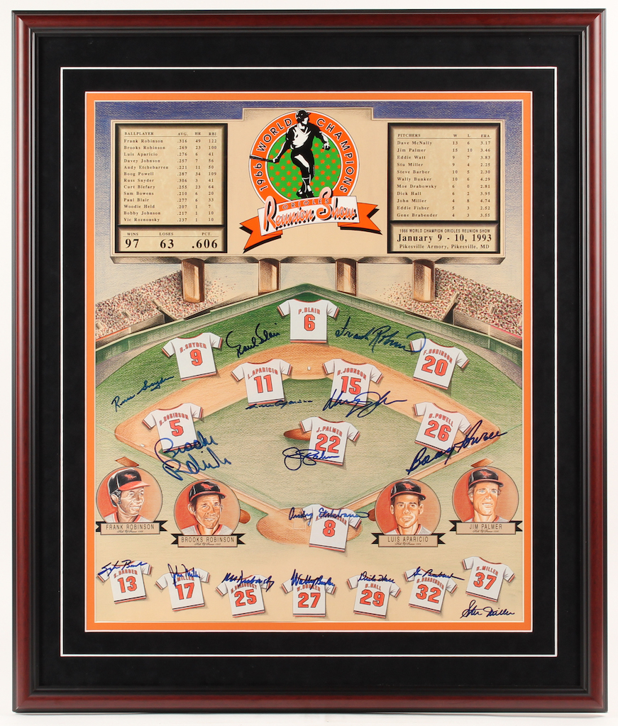 Custom framed display measures approximately 27" x 32" in size and features a 20" x 24" poster that has been hand-signed in blue felt-tip pen by Brooks Robinson, Luis Aparicio, Frank Robinson Jim Palmer, Boog Powell, Davey Johnson, Paul Blair, Steve Barber, John Miller, Moe Drabowsky, Wally Bunker, Dick Hall, Gene Brabender, Stu Miller, Andy Etchebarran, and Russ Snyder.