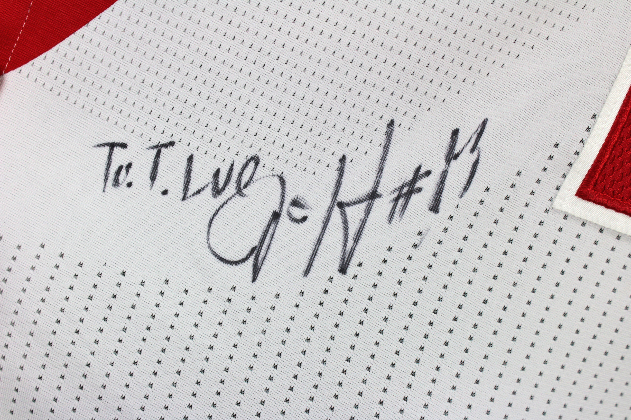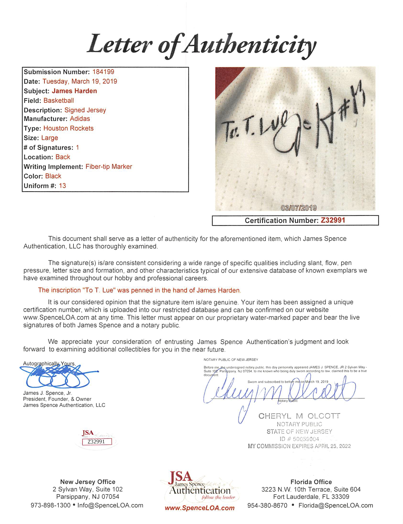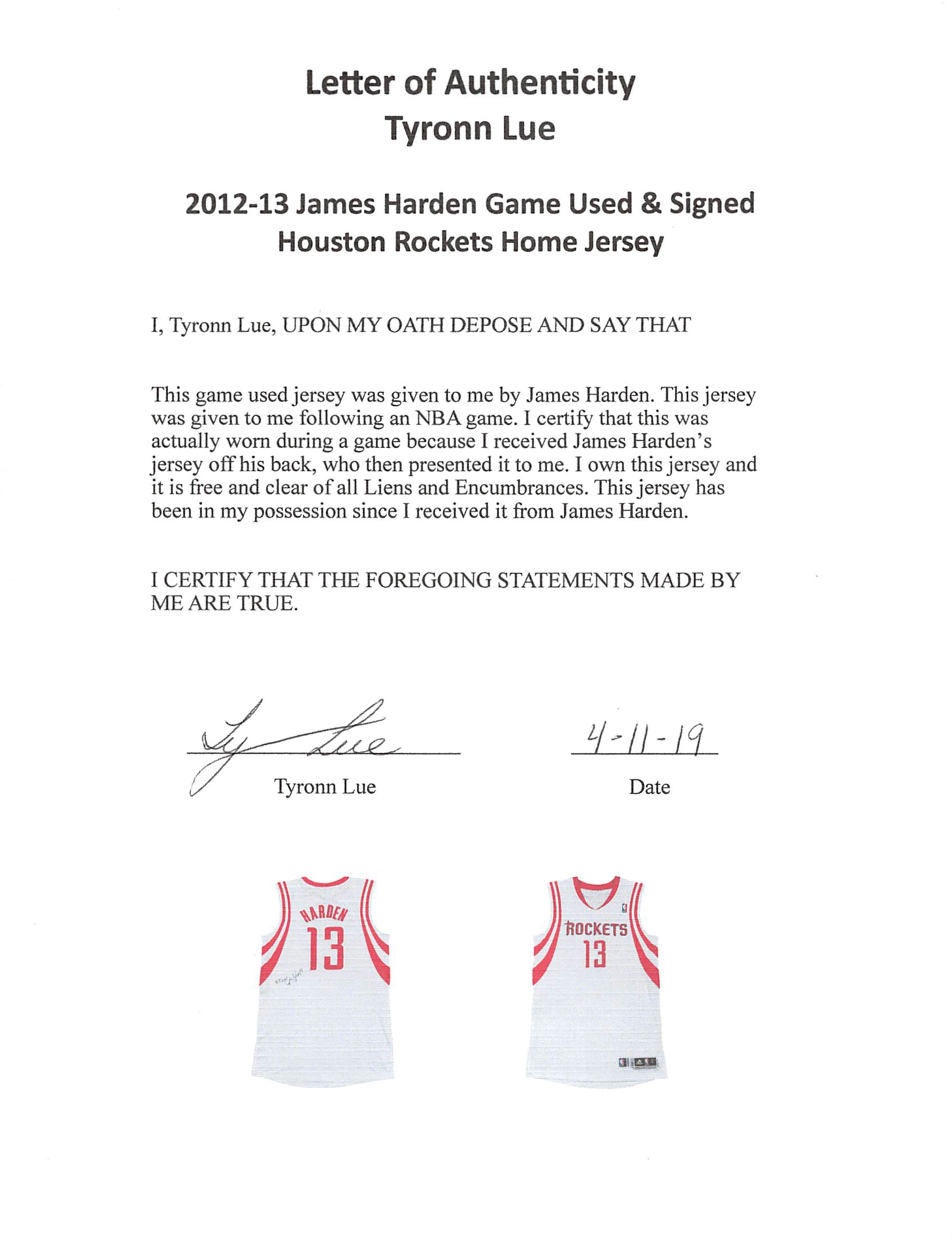 Adidas on-court style game-used jersey. Everything is sewn on, size L. Hand-signed in black felt-tip pen by James Harden. Please note, the autograph has been personalized to "T. Lue" (Tyronn Lue).