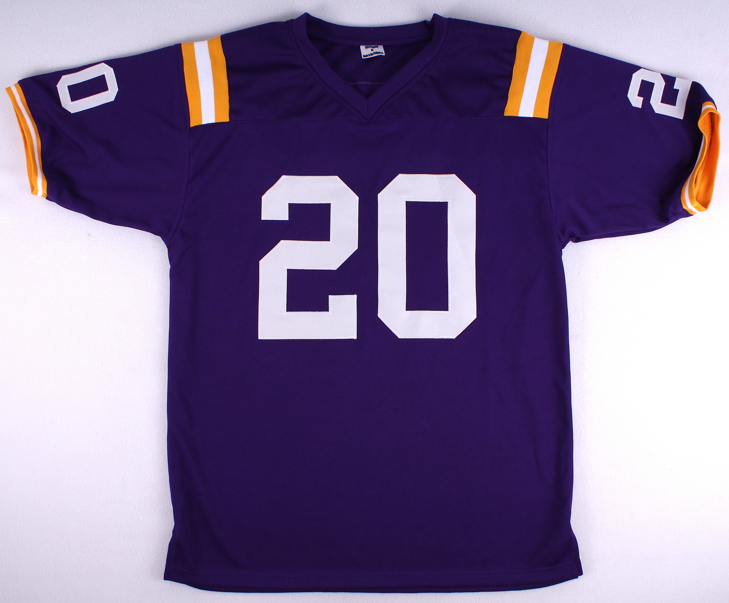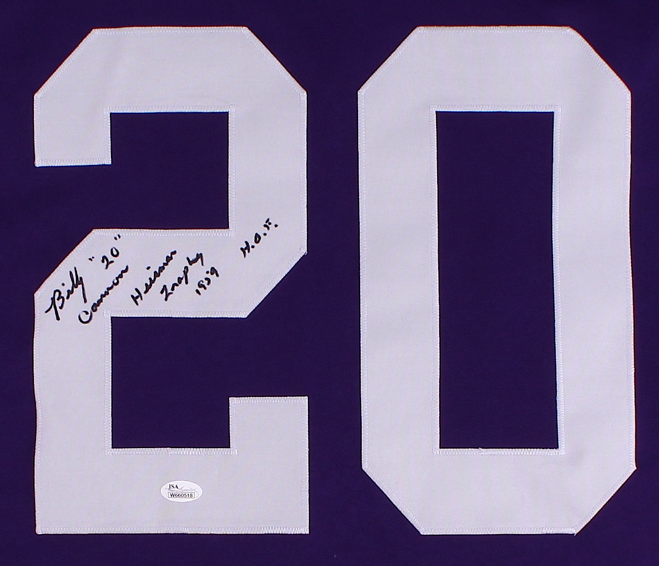 Custom on-field style jersey. Everything sewn on, size XL. Hand-signed and inscribed in black felt-tip pen by Billy Cannon (Oilers). The autograph includes an official James Spence Authentication (JSA) hologram and matching COA for authenticity purposes. The signing of this item was witnessed by JSA.
