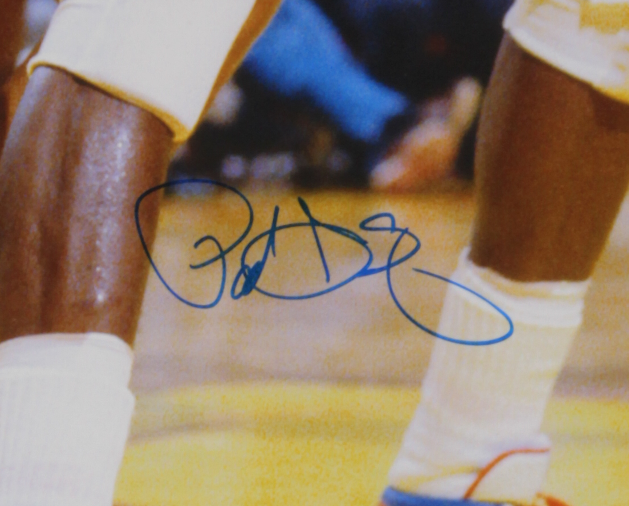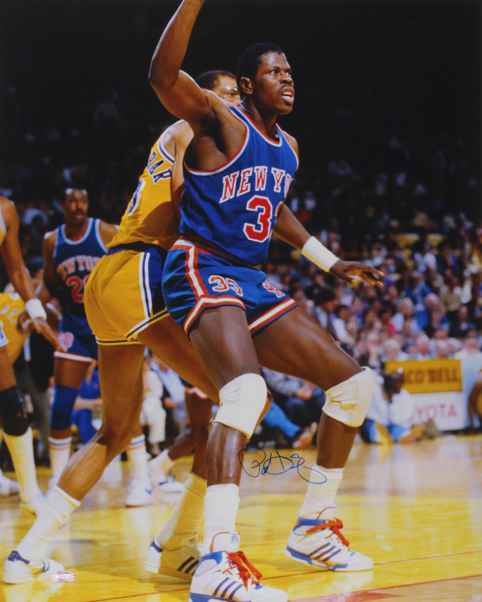 Photo measures 16" x 20" in size and has been hand signed in blue felt-tip pen by Patrick Ewing (HOF).