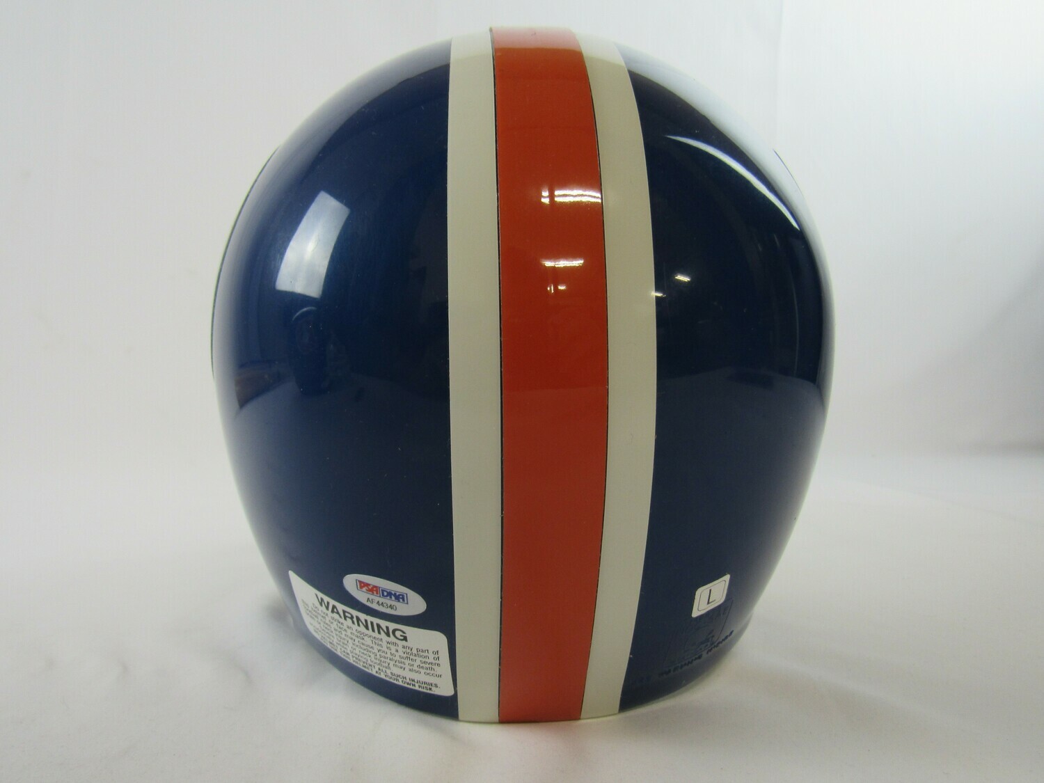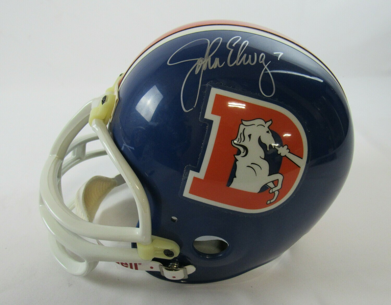 Riddell Denver Broncos full-size replica throwback helmet. Hand-signed in silver paint pen by John Elway (HOF).