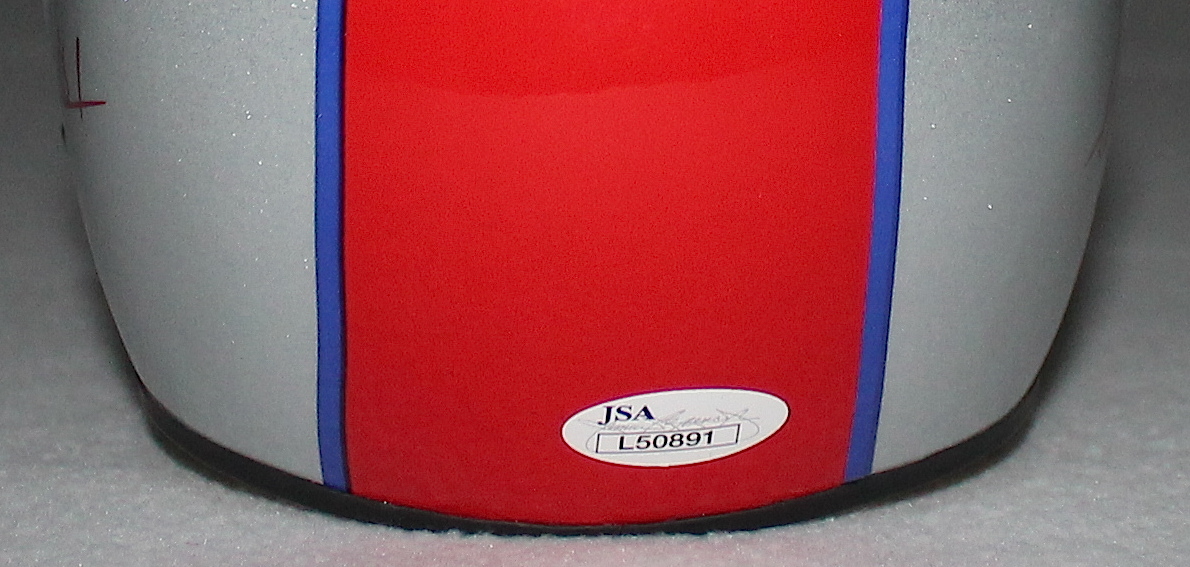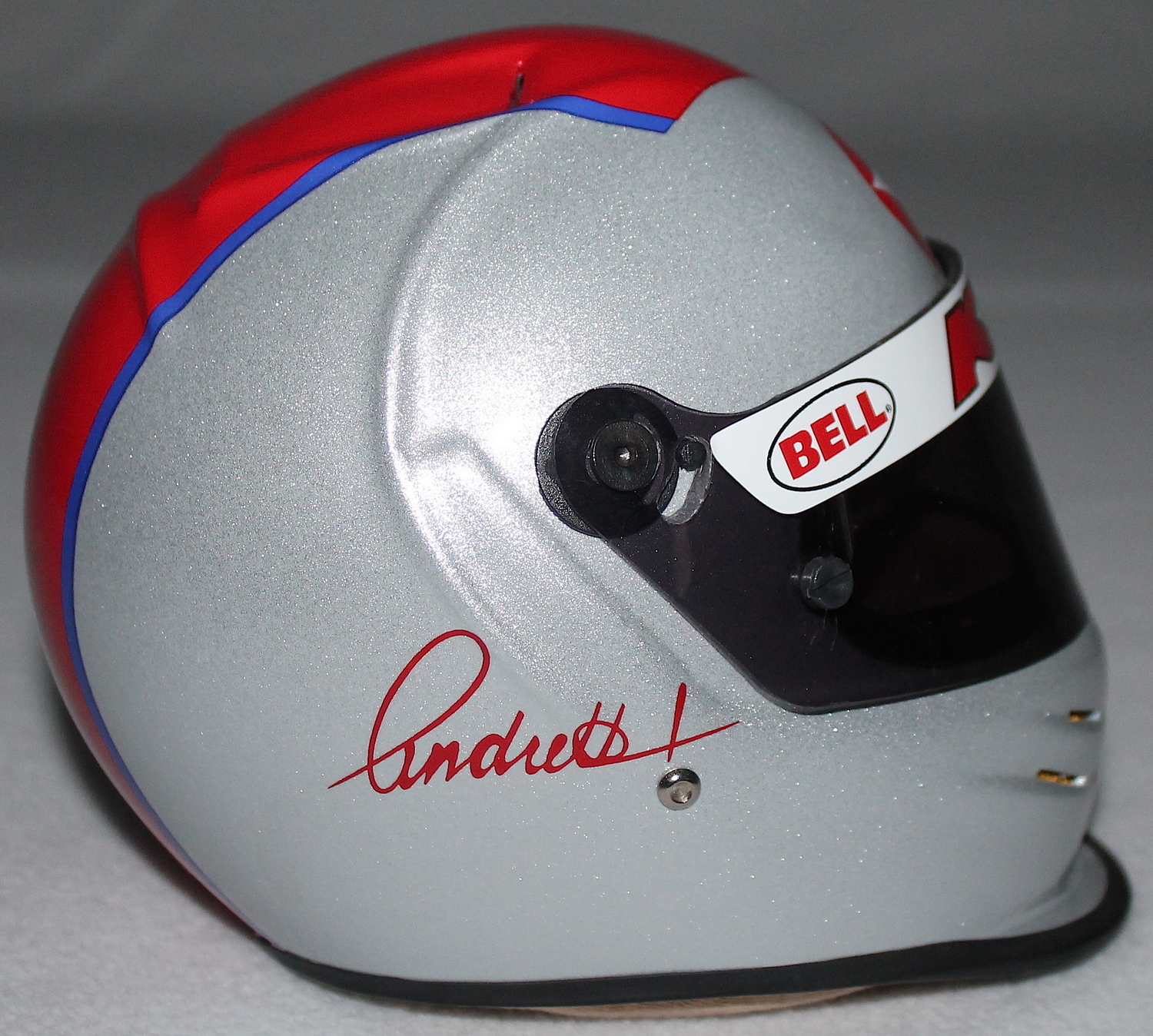 Bell mini-helmet hand-signed in blue felt-tip pen by Mario Andretti. The autograph includes an official James Spence Authentication (JSA) hologram and matching COA for authenticity purposes.
