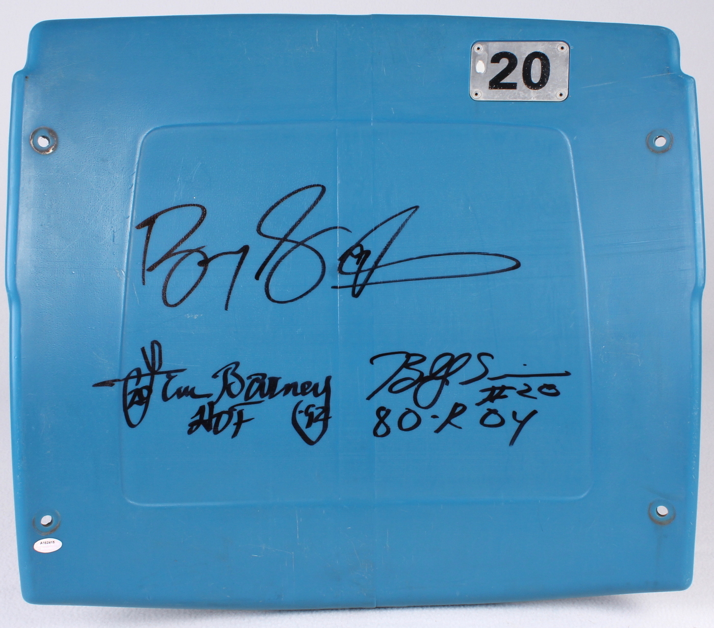 Silverdome actual blue number 20 stadium seat back hand-signed in black felt tip pen by Barry Sanders (HOF), Lem Barney (HOF) and Billy Sims. The autograph includes an official Schwartz Sports Hologram and matching COA for authenticity purposes.