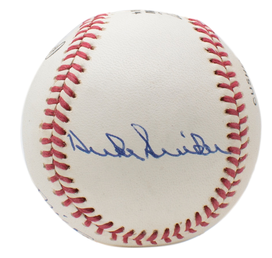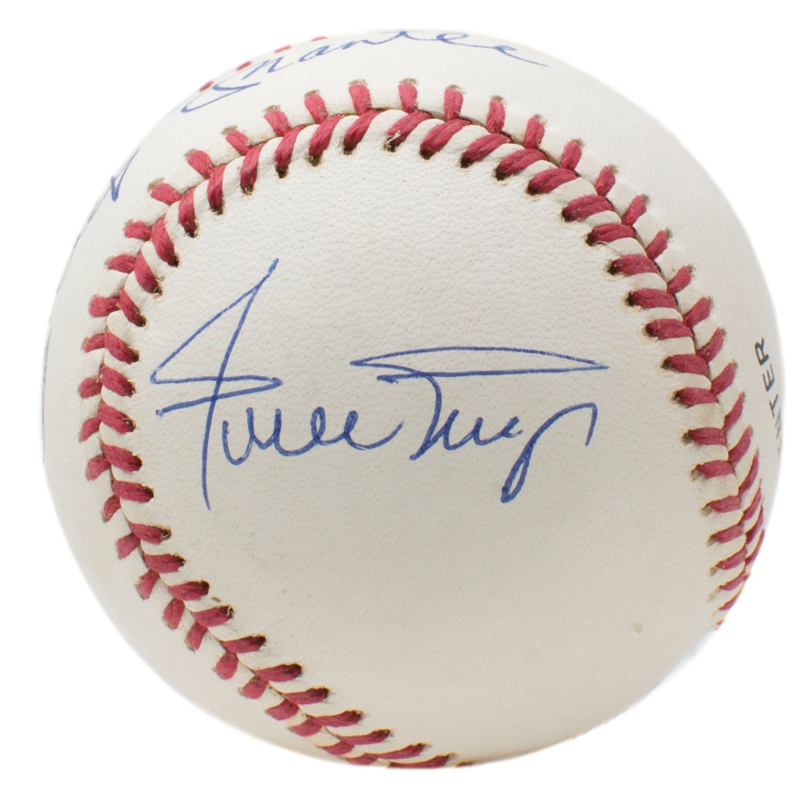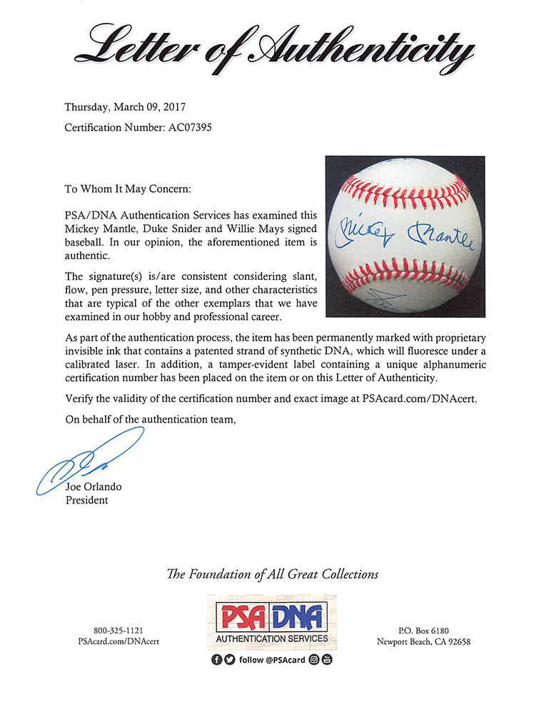Rawlings Official National League Baseball has been hand-signed in blue ink pen by Mickey Mantle (D. 1995, HOF), Duke Snider (D. 2011, HOF), and Willie Mays (HOF). Please see photos for details regarding the condition of the baseball.