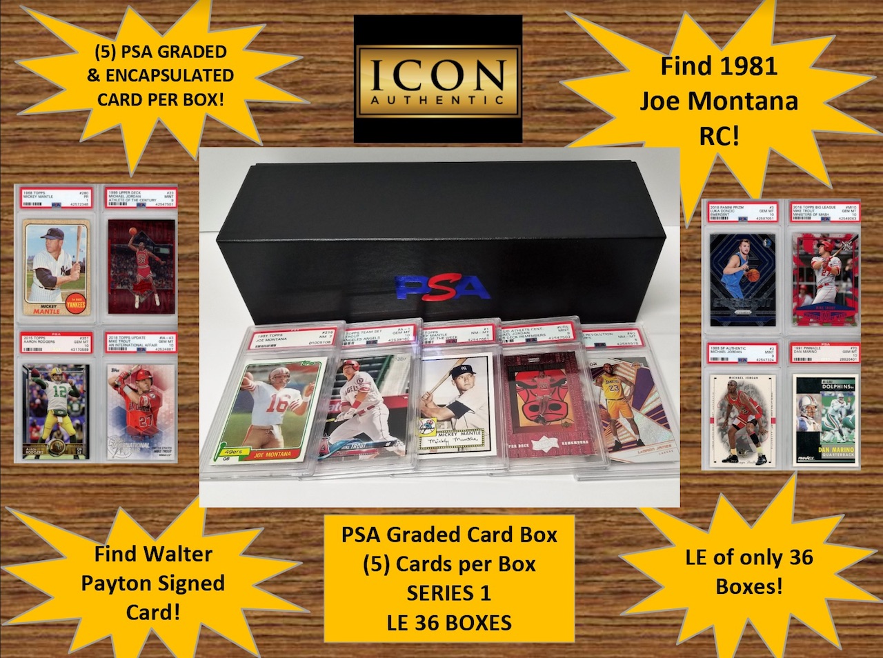 PSA Graded Card Mystery Box – Series 1 – You get (5) Graded PSA Cards in every box! Excellent chance to a get a key hit card or autographed card with a Limited Edition Run of only 36 Boxes.