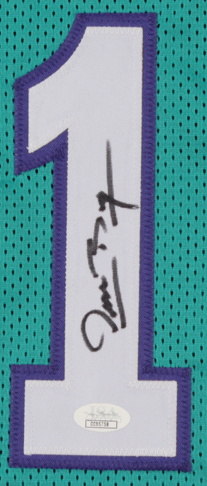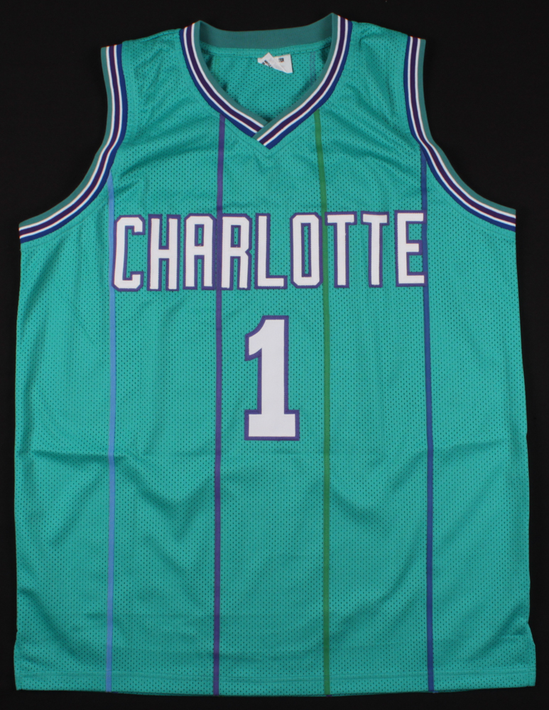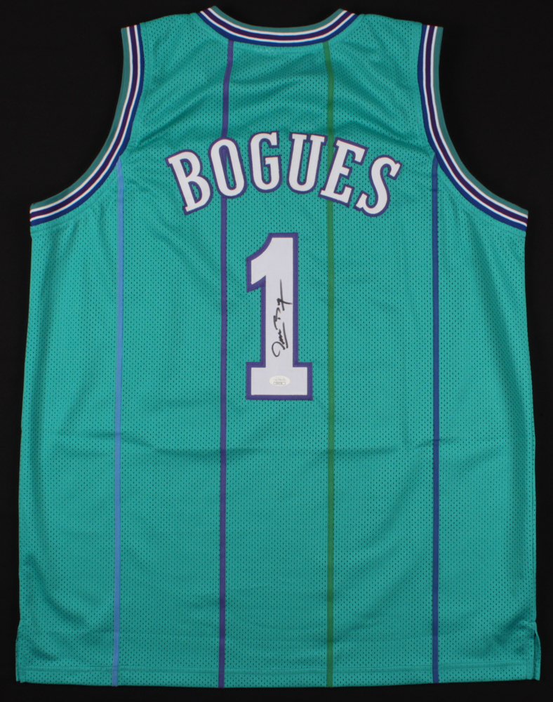 Custom on-court style jersey. Everything is sewn on, size XL. Hand-signed in black felt-tip pen by Muggsy Bogues.