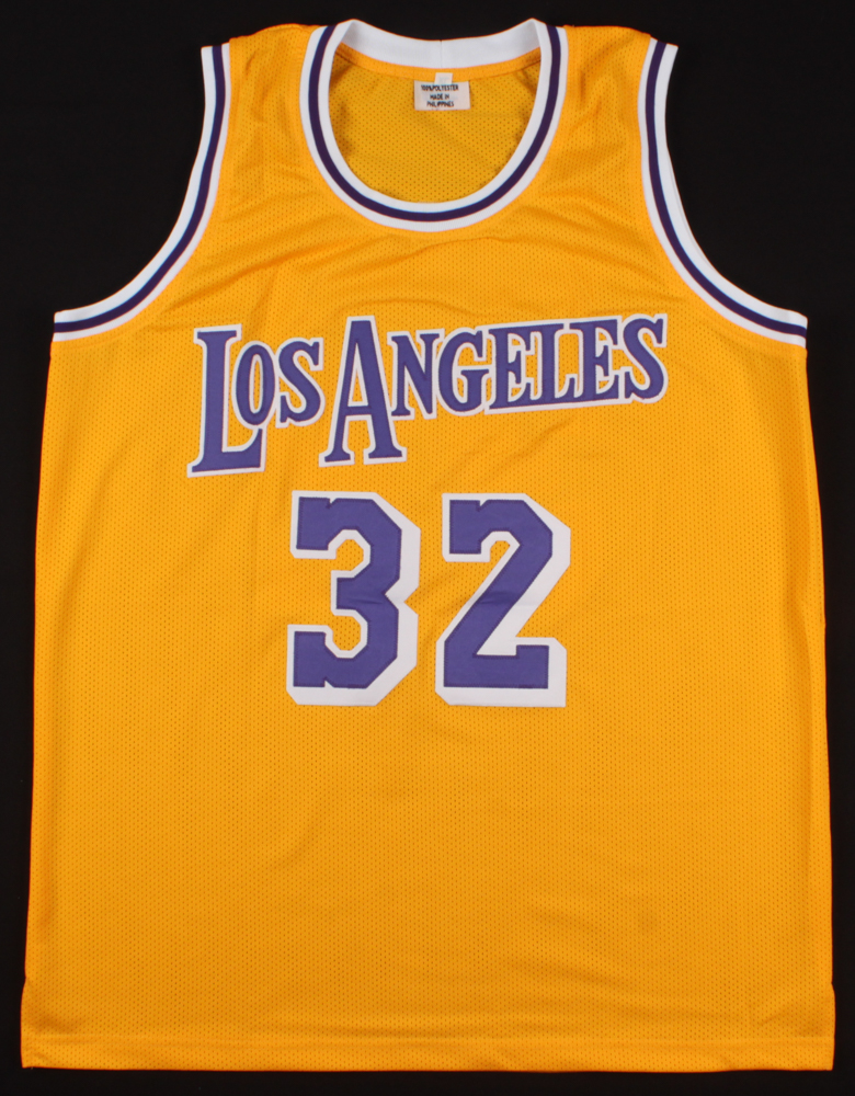 Custom on-court style jersey. Everything is sewn on, size XL. Hand-signed in silver paint pen by Magic Johnson (HOF).