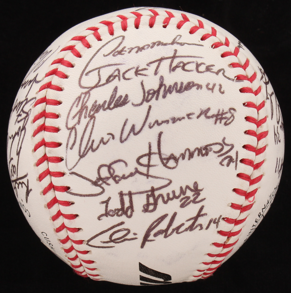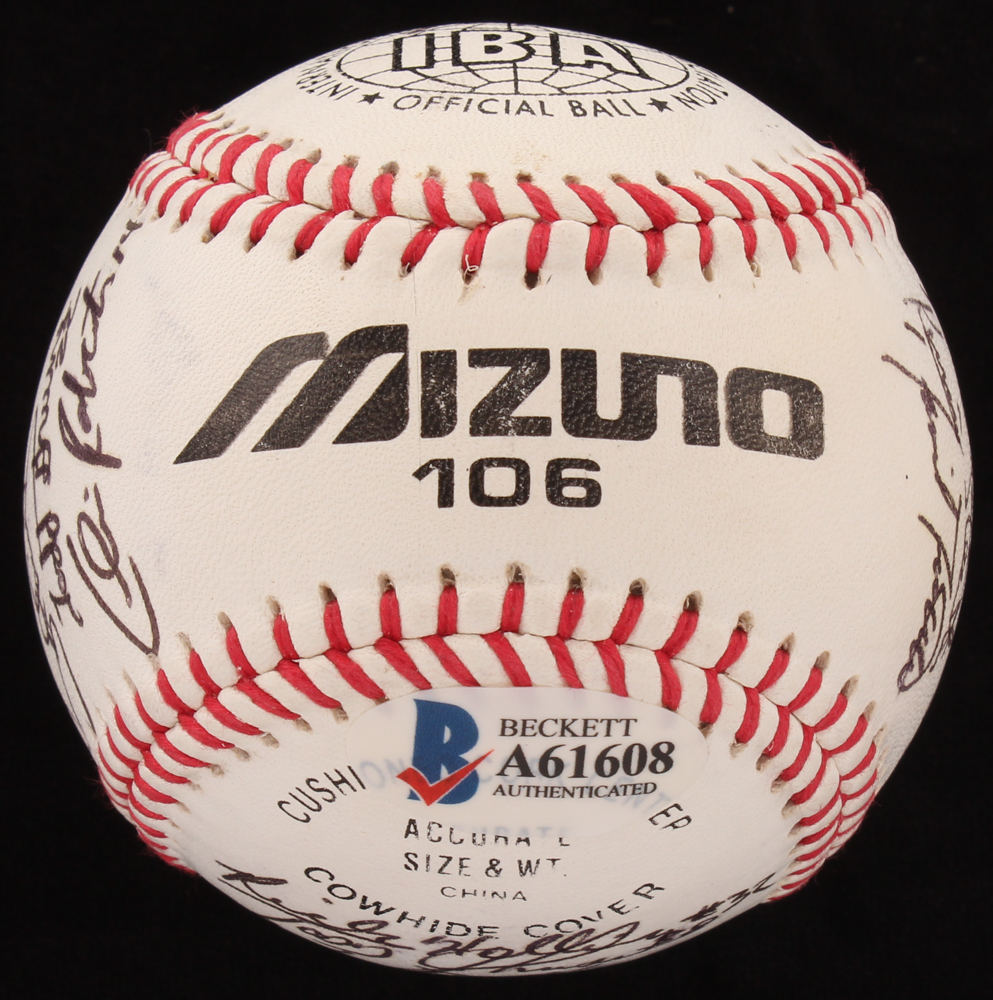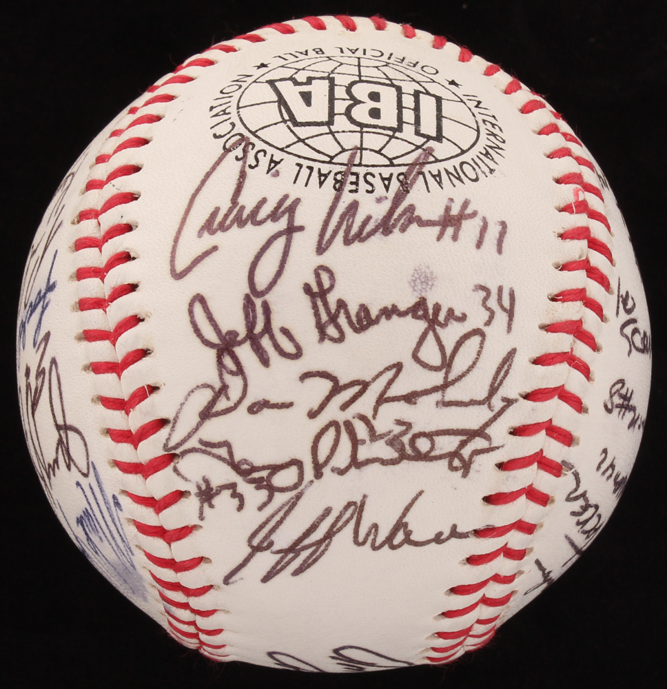 Mizuno 106 International Baseball Association Baseball. Hand-signed in black and blue ink pen by Jason Giambi, Todd Greene, Darren Dreifort, Phil Nevin, Charles Johnson, Rick Helling, Todd Taylor, Craig Wilson, Mark Johnson, Jack Hacker, Steve Rodriguez, Chris Wimmer, Jeffrey Hammonds, Paul Shuey, Kennie Steenstra, Dan Melendez, and 15 other players.