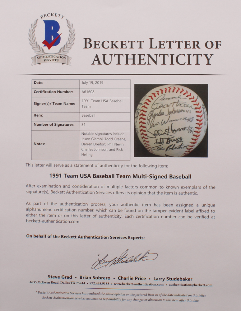 1991 Team USA Collegiate National Team Baseball Signed by (31) with Jason Giambi, Todd Greene, Darren Dreifort, Phil Nevin (Beckett LOA)