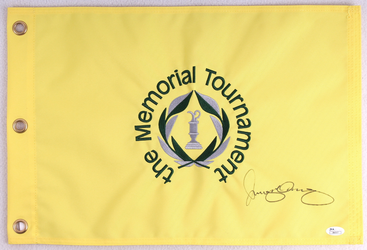 The Memorial Tournament pin flag. Hand-signed in black felt-tip pen by Rory McIlroy. The autograph includes an official James Spence Authentication (JSA) hologram and matching COA for authenticity purposes.