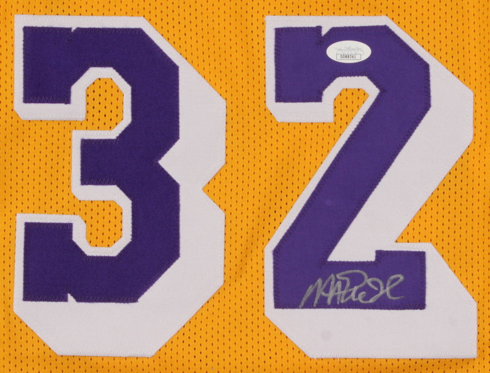 Custom on-court style jersey. Everything is sewn on, size XL. Hand-signed in silver paint pen by Magic Johnson (HOF).