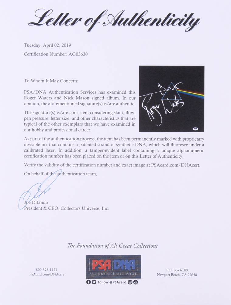 Roger Waters & Nick Mason Signed Pink Floyd "The Dark Side of the Moon" Vinyl Record Album Cover (PSA LOA)