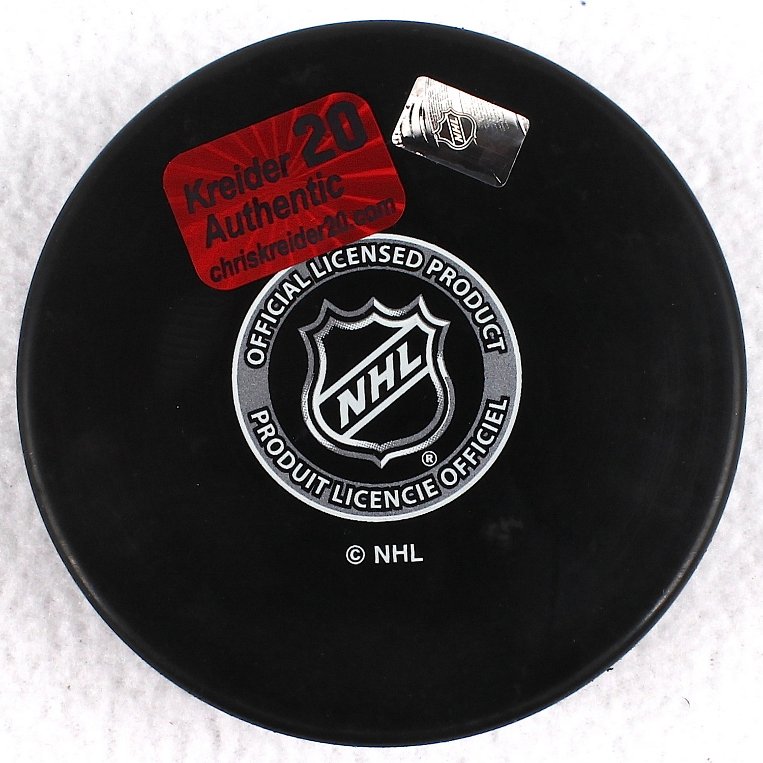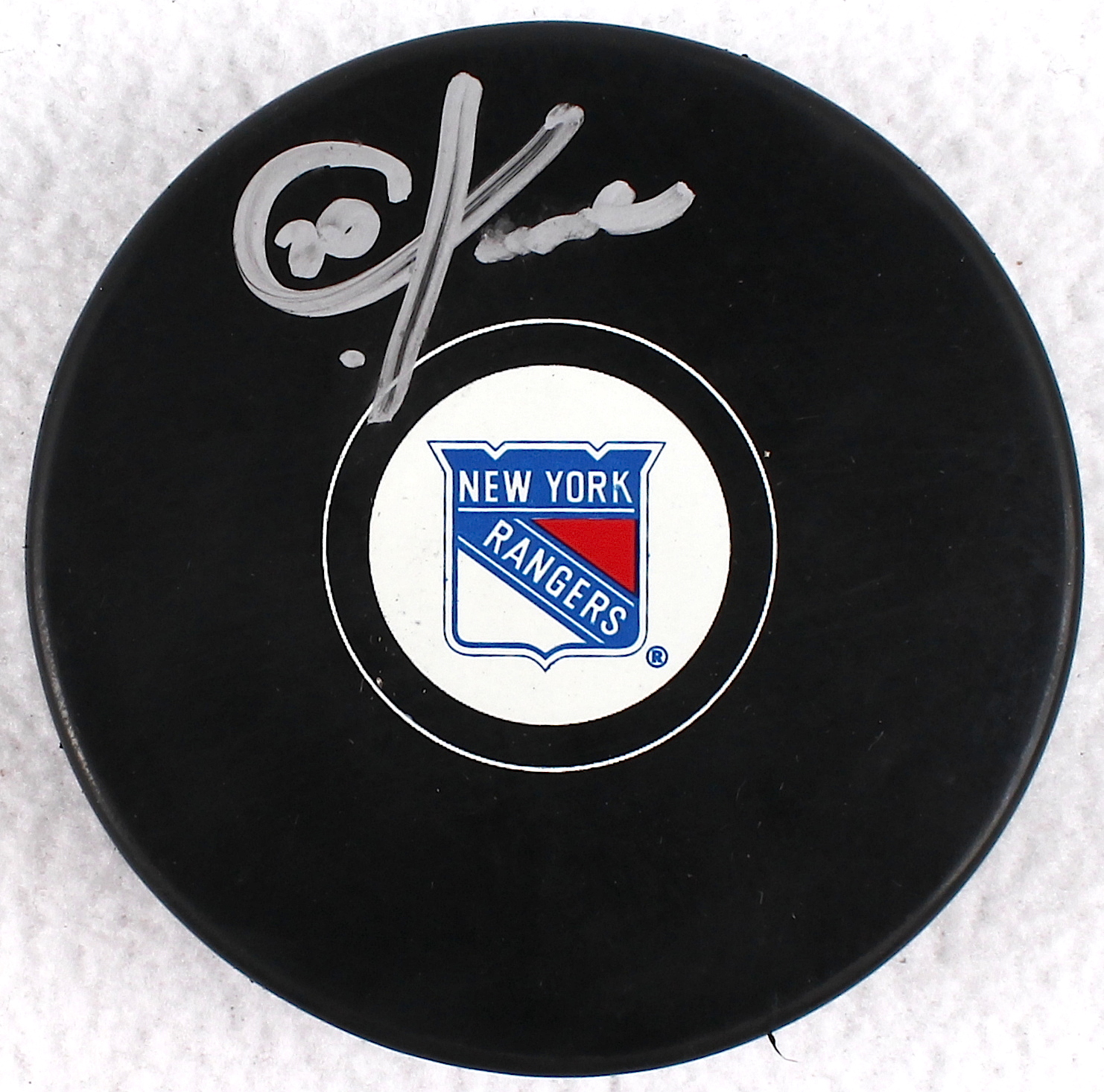 New York Rangers logo hockey puck. Hand-signed in silver paint paint-pen by Chris Kreider. The autograph includes an official Chris Kreider hologram for authenticity purposes.