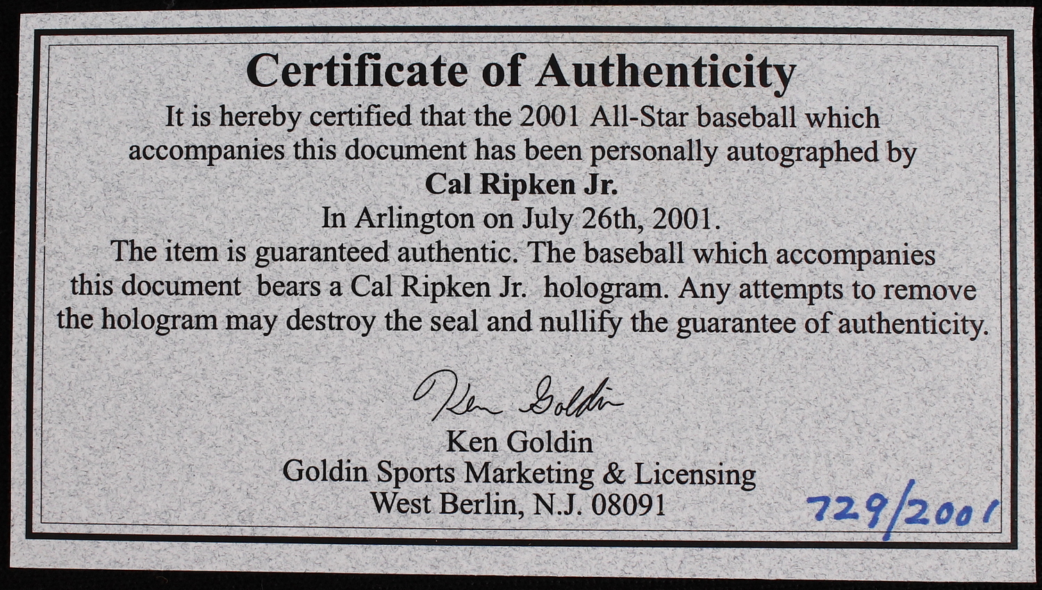 Rawlings Official Major League 2001 All-Star Game baseball hand-signed and inscribed by Cal Ripken Jr. (Orioles HOF). The ball is stamped and post marked 7/10/2001, the date of the All-Star game. Limited Edition hand-numbered 729/2001. The ball includes an official Cal Ripken Jr. hologram for authenticity purposes.