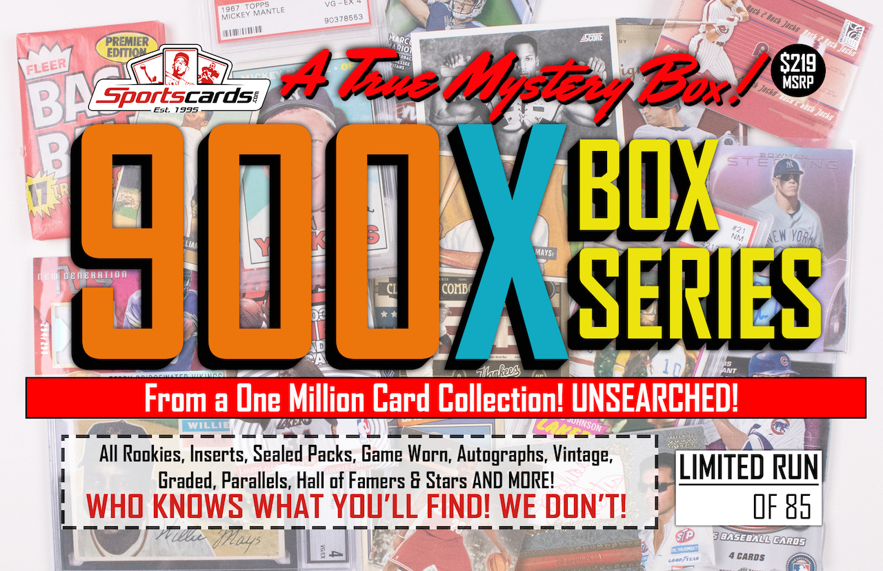 We (Sportscards.com) have been waiting for the opportunity to offer a Mystery box like this and here it is, The Mystery 900X Series Box – A True Mystery sports card product! We recently purchased a massive collection (Over 1 million quality cards) full of anything and everything you could imagine including: