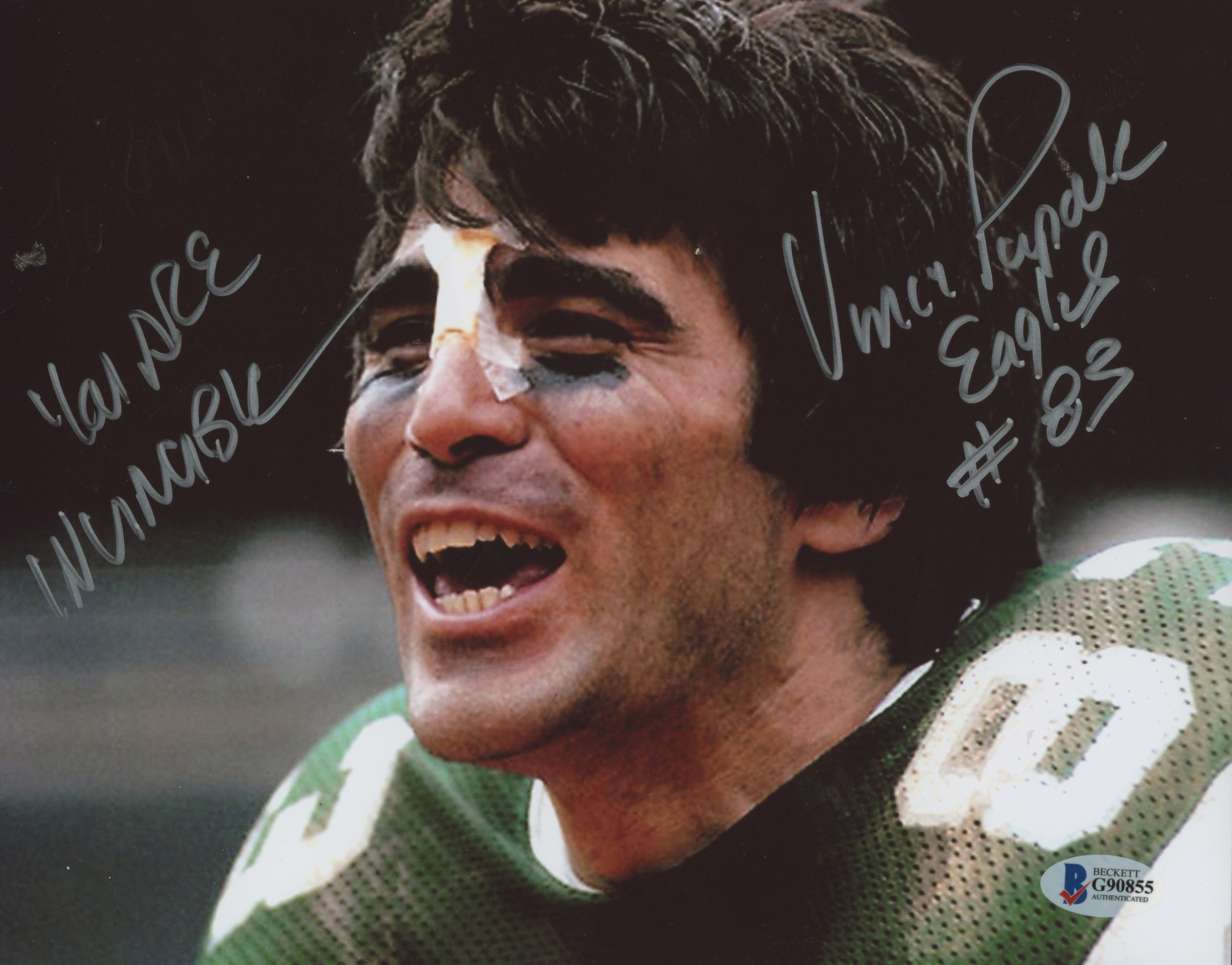 Photo measures 8" x 10" in size and has been hand-signed in silver paint pen by Vince Papale.
