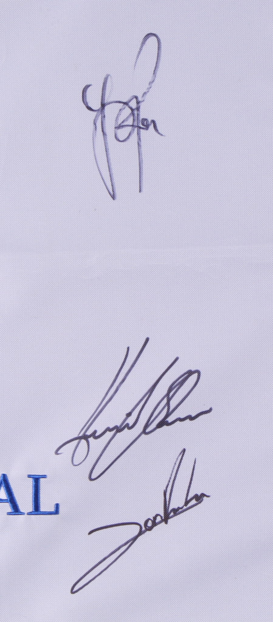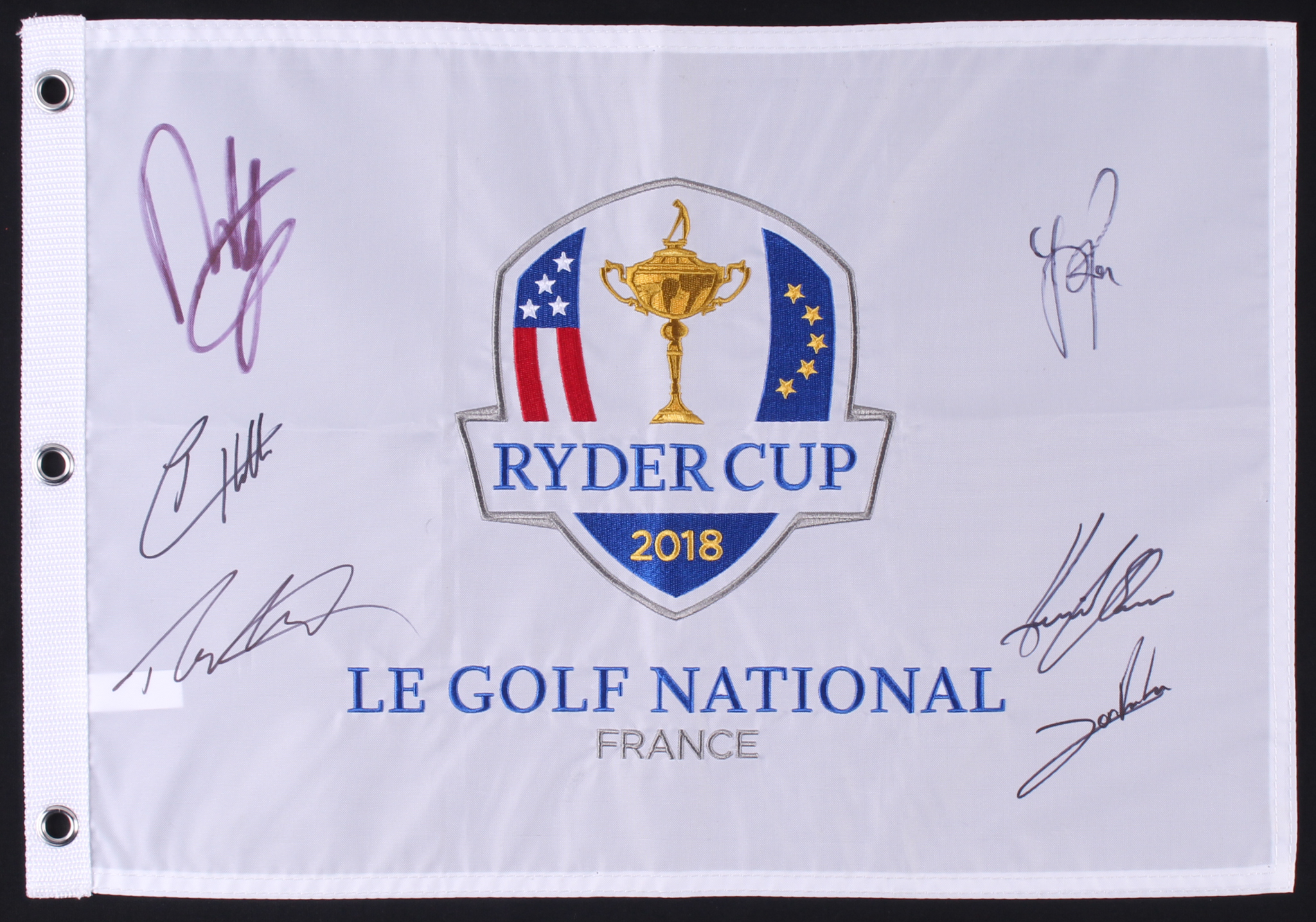2018 Ryder Cup Golf Pin Flag. Hand-signed in black felt-tip pen by (6) with Jon Rahm, Justin Rose, Henrik Stenson, Tommy Fleetwood, Francesco Molinari and Tyrrell Hatton.