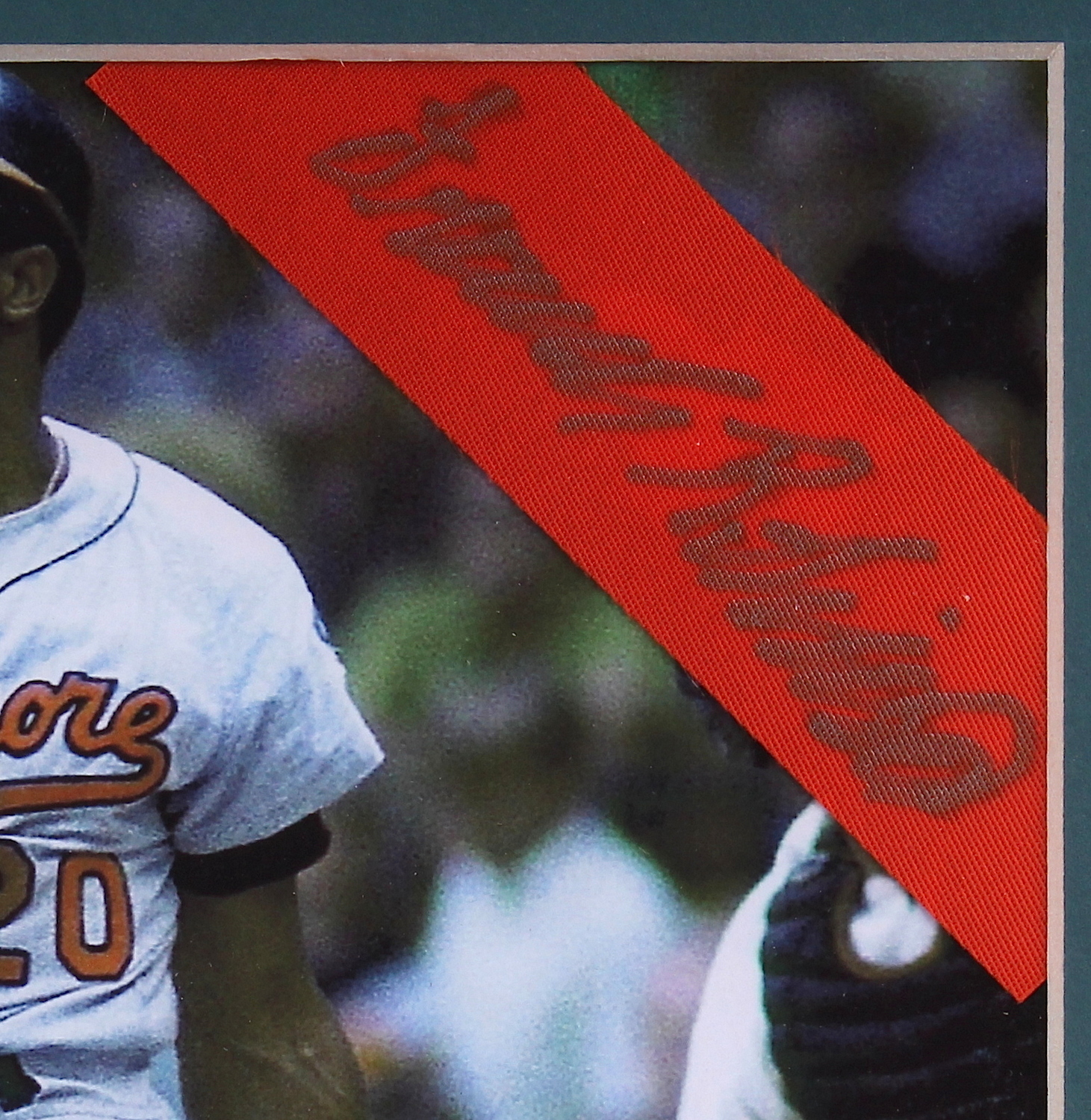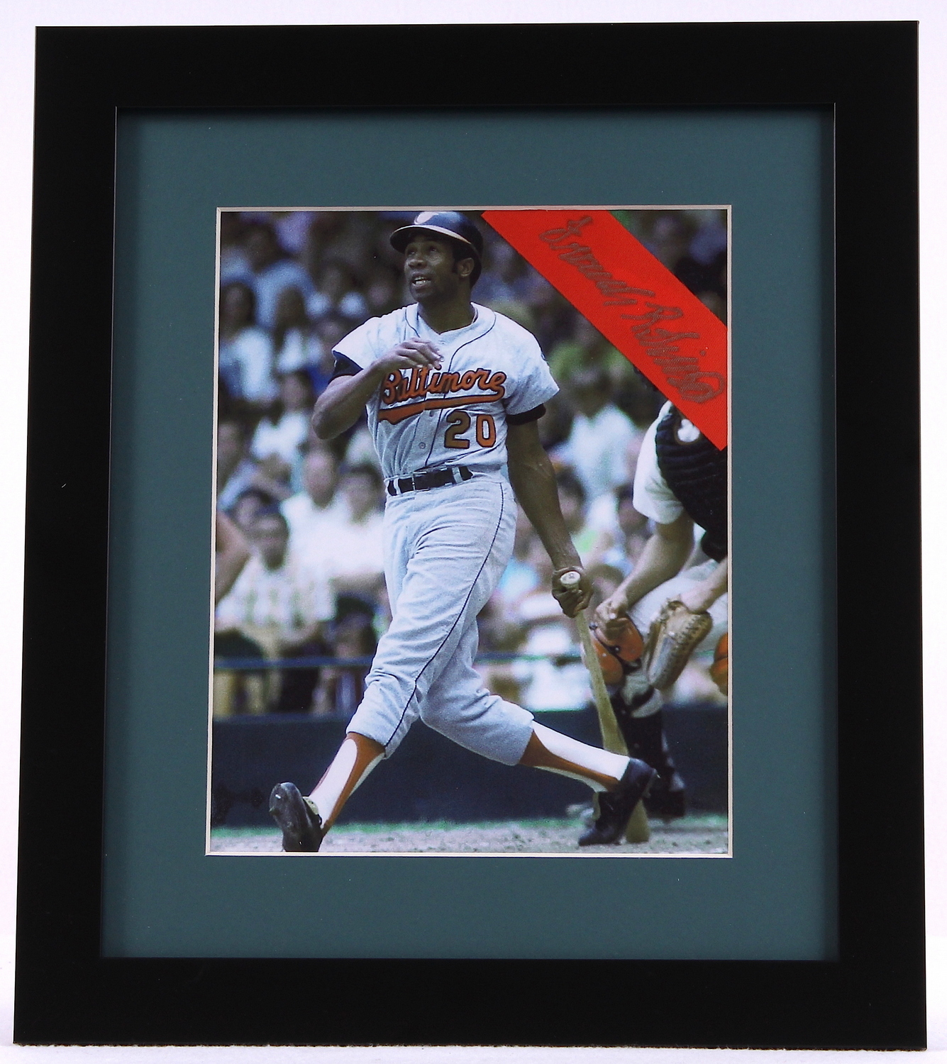 Custom framed photo display measures 13" x 15". Features a photo that has been hand-signed in silver paint pen by Frank Robinson (Reds HOF). The autograph includes an official PSA/DNA hologram and matching COA for authenticity purposes.