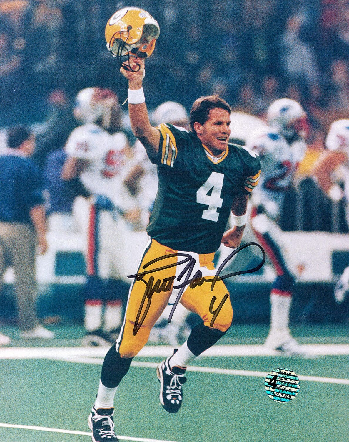 Photo measures 8" x 10" in size and has been hand-signed in black felt tip pen by Brett Favre. Autograph includes an official Brett Favre hologram and COA for authenticity purposes. Also includes a photo from the signing.