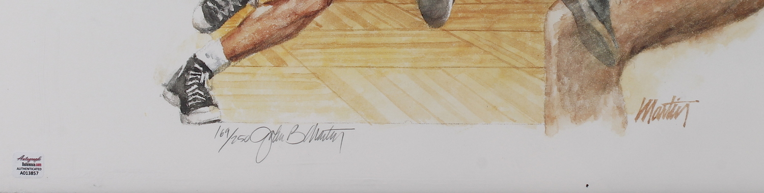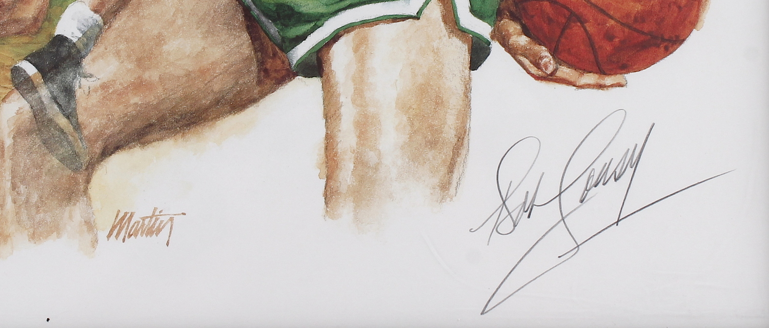 Custom framed photo measures 18" x 24" in size and features a lithograph which has been hand-signed in pencil by Bob Cousy (Celtics HOF). Also signed by the artist, John B. Marin. Please note, there is a minor crack in the glass and one of the backings is missing. Please see photos for more details. The autograph includes an official Autograph Reference hologram for authenticity purposes.