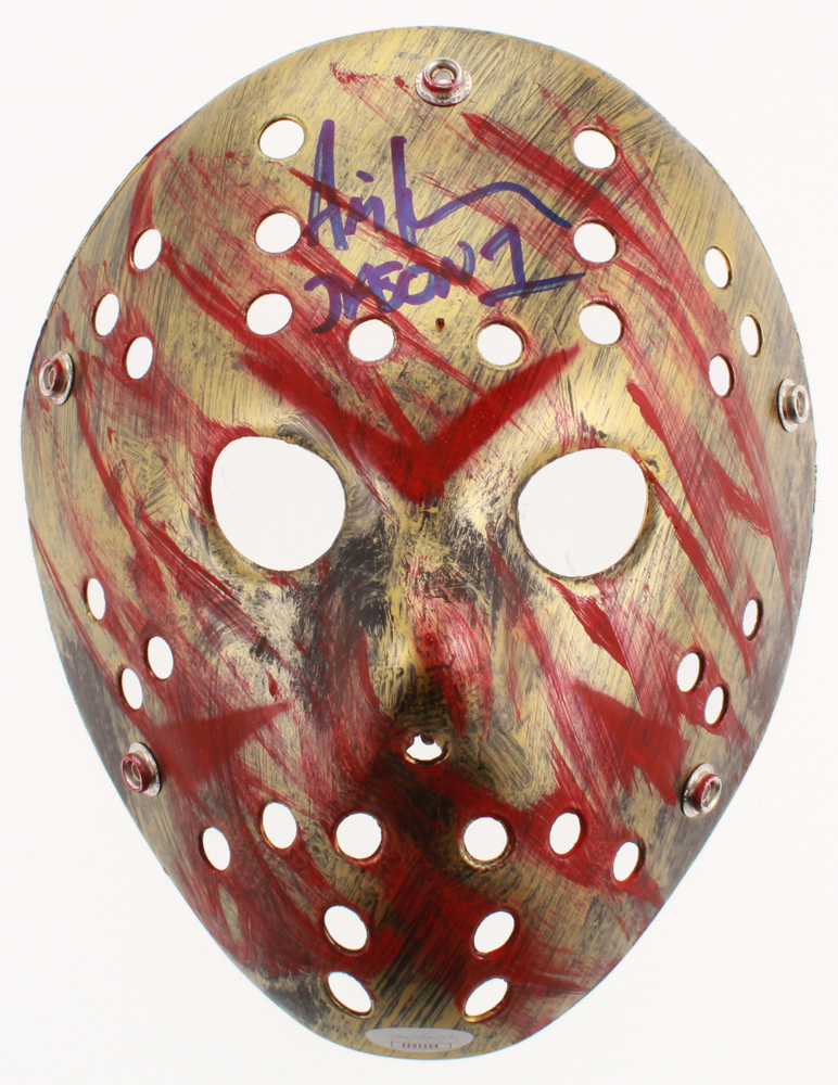 Custom "Friday the 13th" Jason Voorhees full-size replica mask. Hand-signed and inscribed in blue felt-tip pen by Ari Lehman.