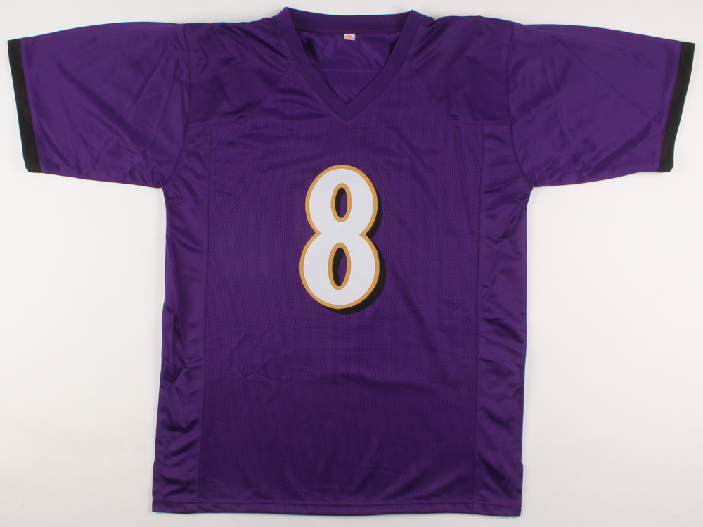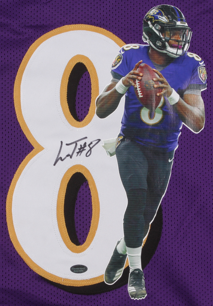 Custom on-field style jersey. Everything sewn on, size XL. Hand-signed in black felt-tip pen by Lamar Jackson. Please note that the jersey contains a custom printed photo between the back numbers of the jersey.