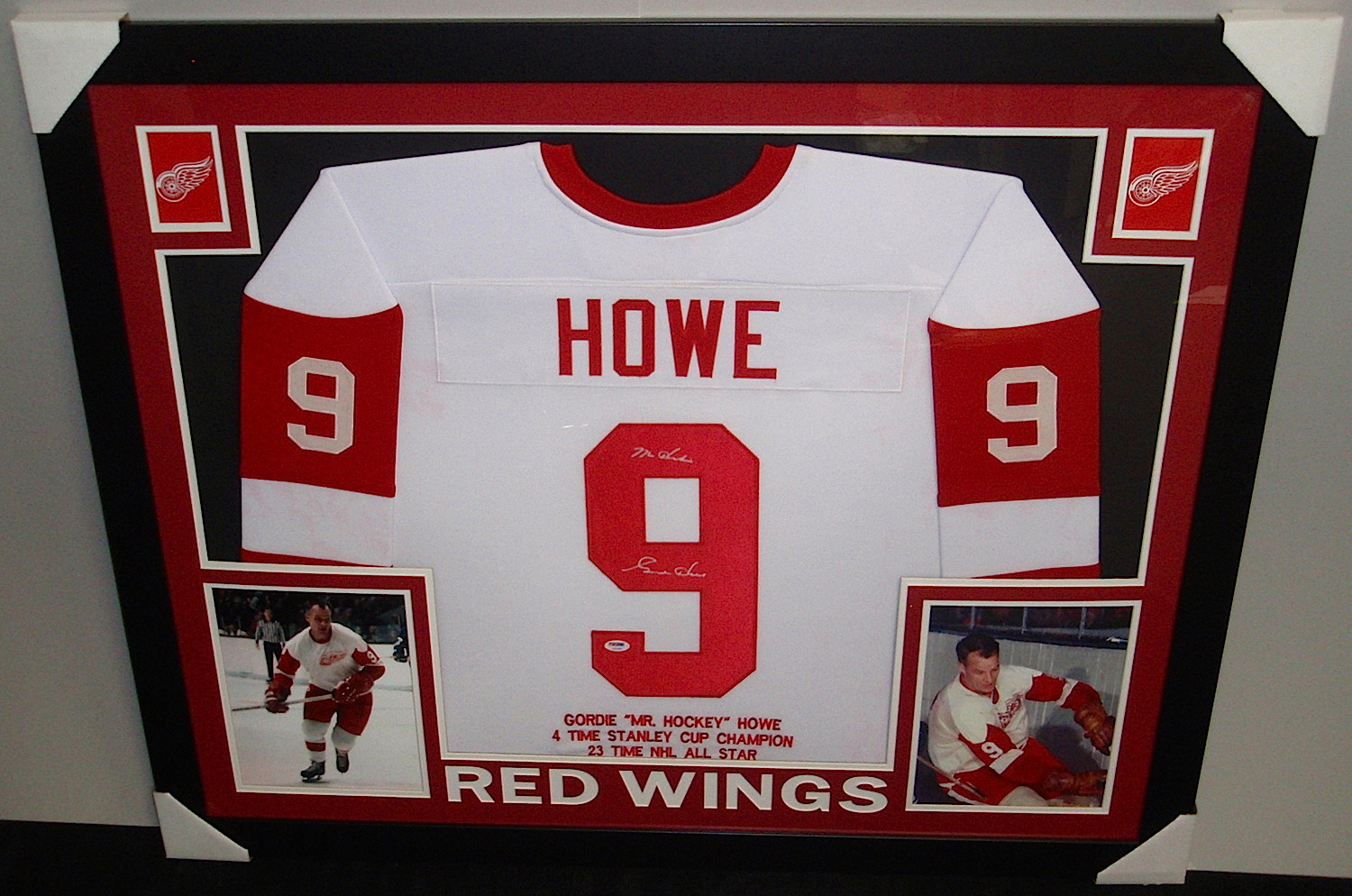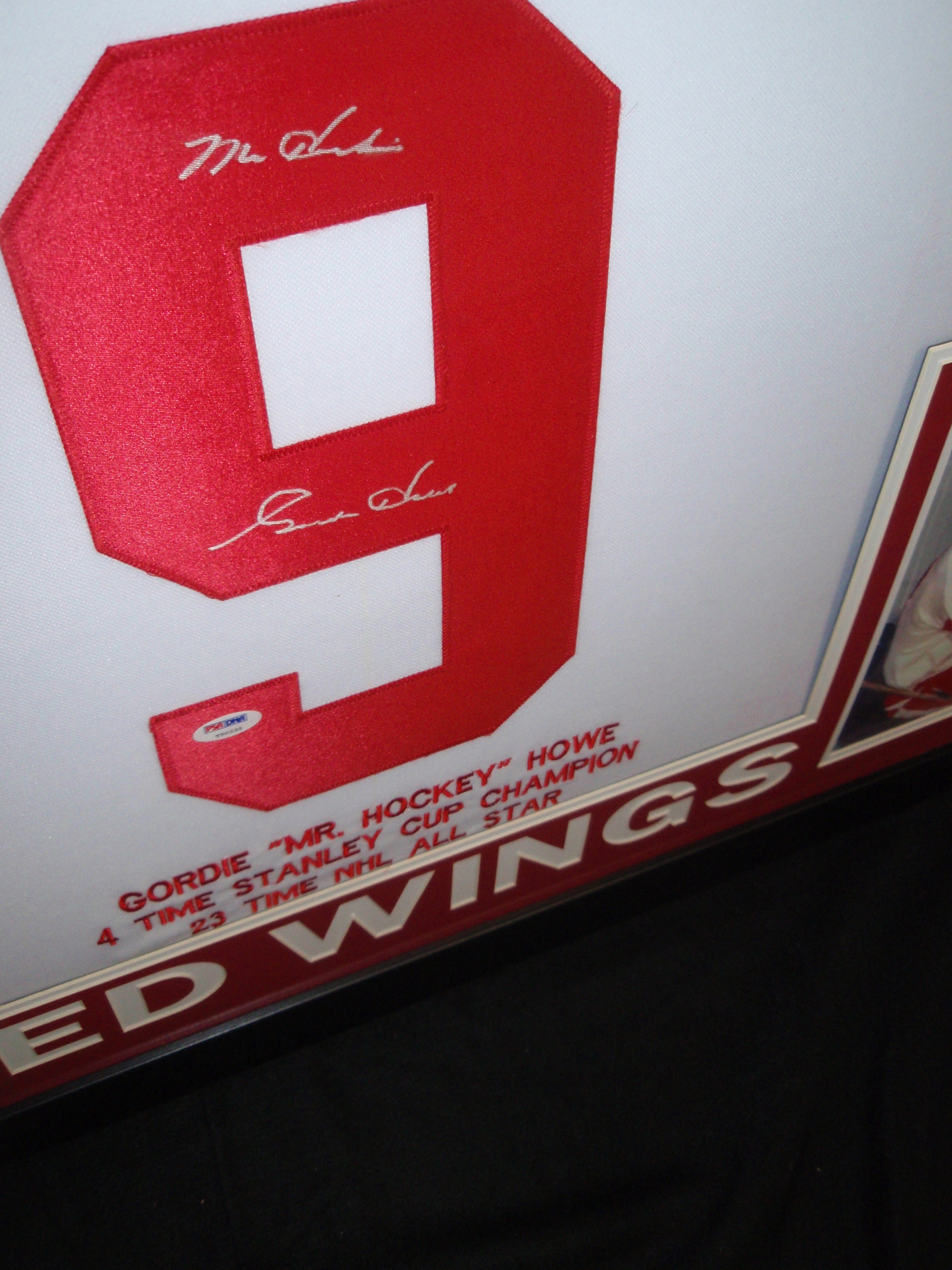 Custom frame measures approximately 35" x 43" in size and features a jersey which has been hand-signed and inscribed in silver paint pen by Gordie Howe (HOF). The autograph includes an official PSA/DNA hologram and matching COA for authenticity purposes.