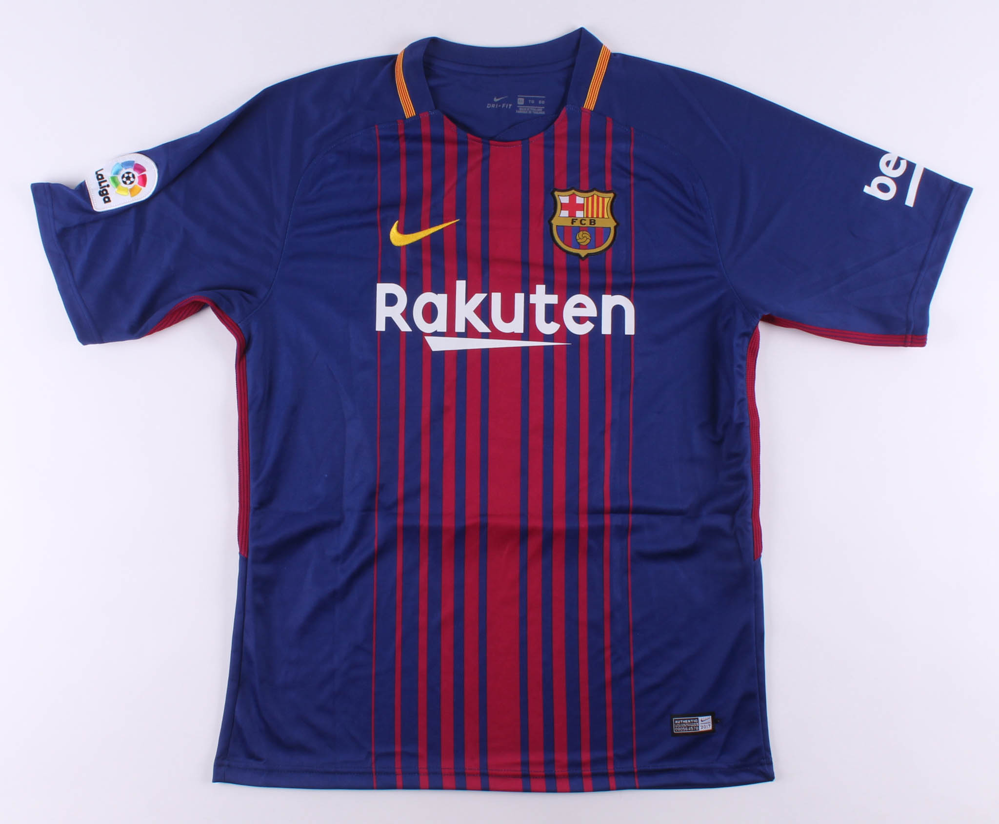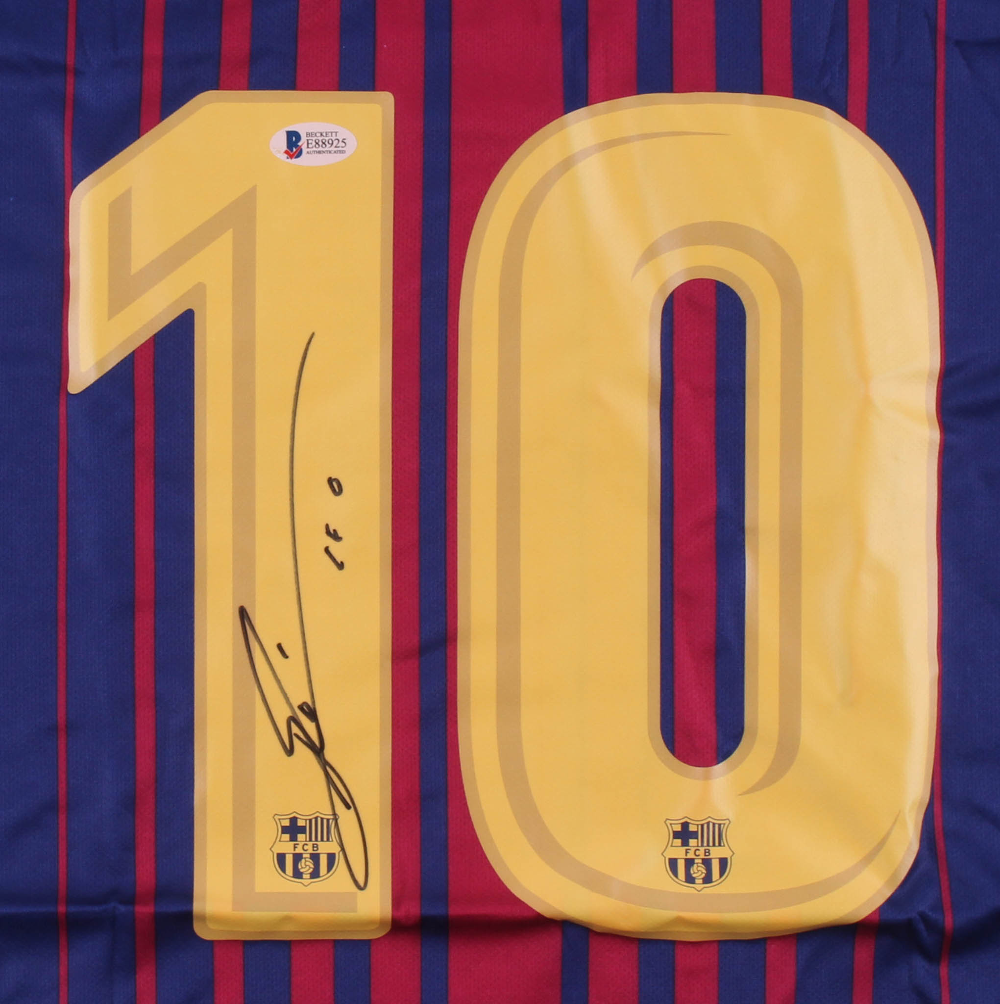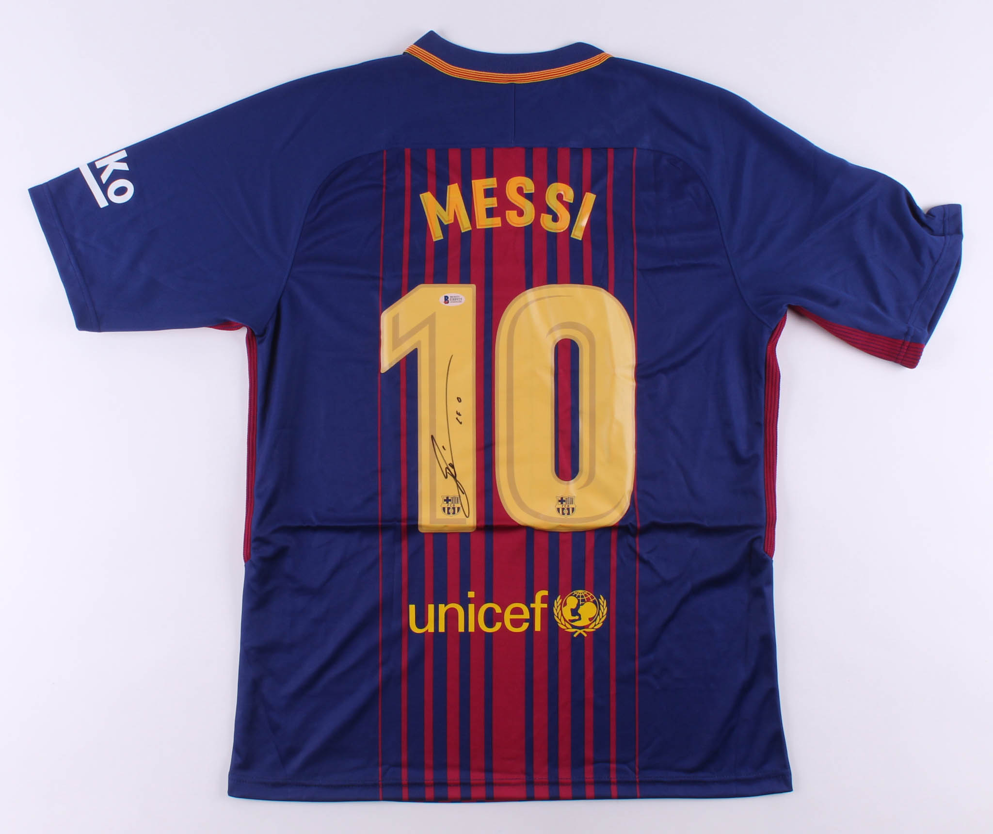 Nike on-field style jersey. Everything is printed on, size XL. Hand-signed and inscribed by Lionel Messi.