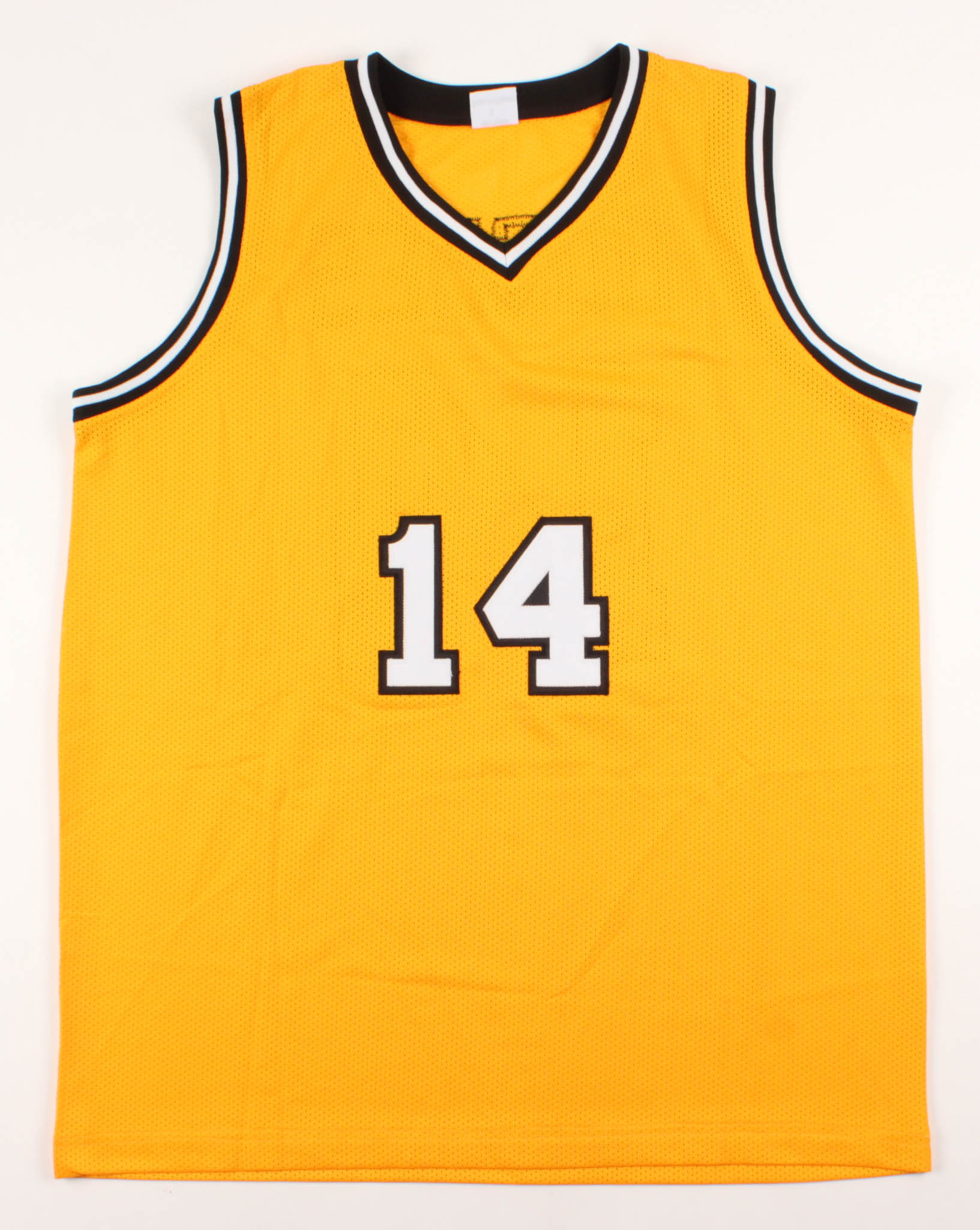 Custom on-court style jersey. Everything sewn on, size XL. Hand-signed in black felt-tip pen by Muggsy Bogues.