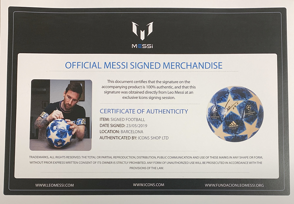 Adidas soccer ball has been hand-signed in black felt-tip pen by Lionel Messi. (Barcelona)