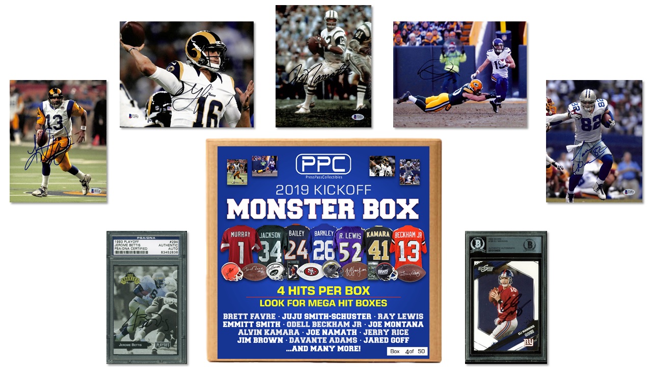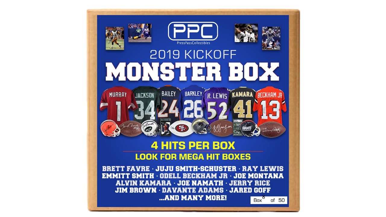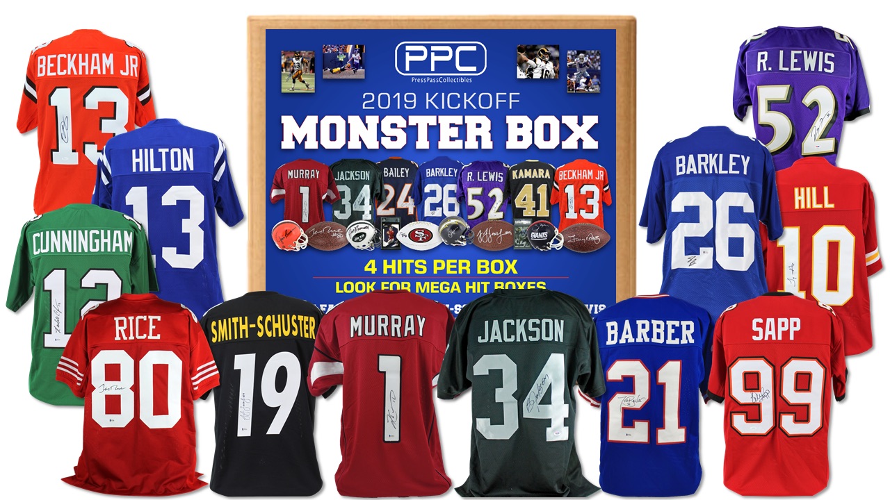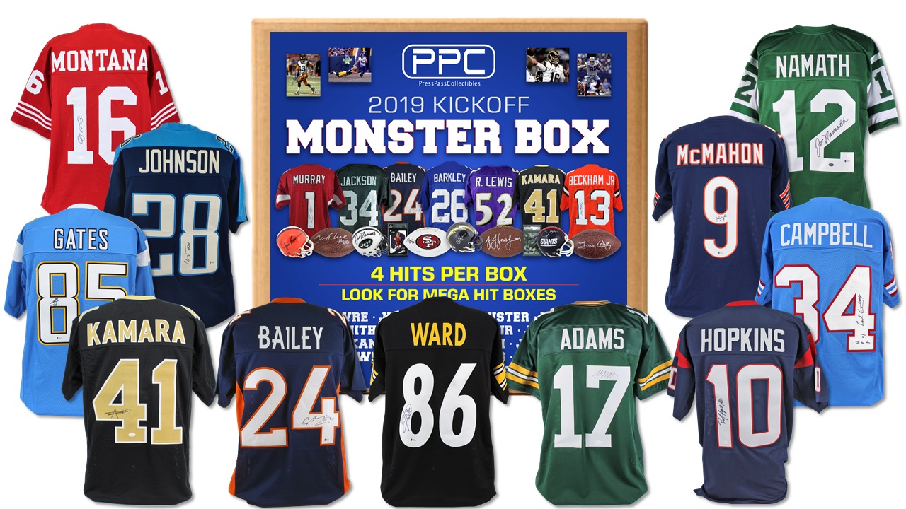 The PPC 2019 NFL Kickoff Monster mystery box includes four (4) premium hits per box. Each box will include one (1) 8x10 photo, one (1) trading card, and one (1) jersey. Each box will also contain a big hit of either one (1) football or one (1) mini helmet. Every box is guaranteed to have at least one (1) Hall of Famer!
