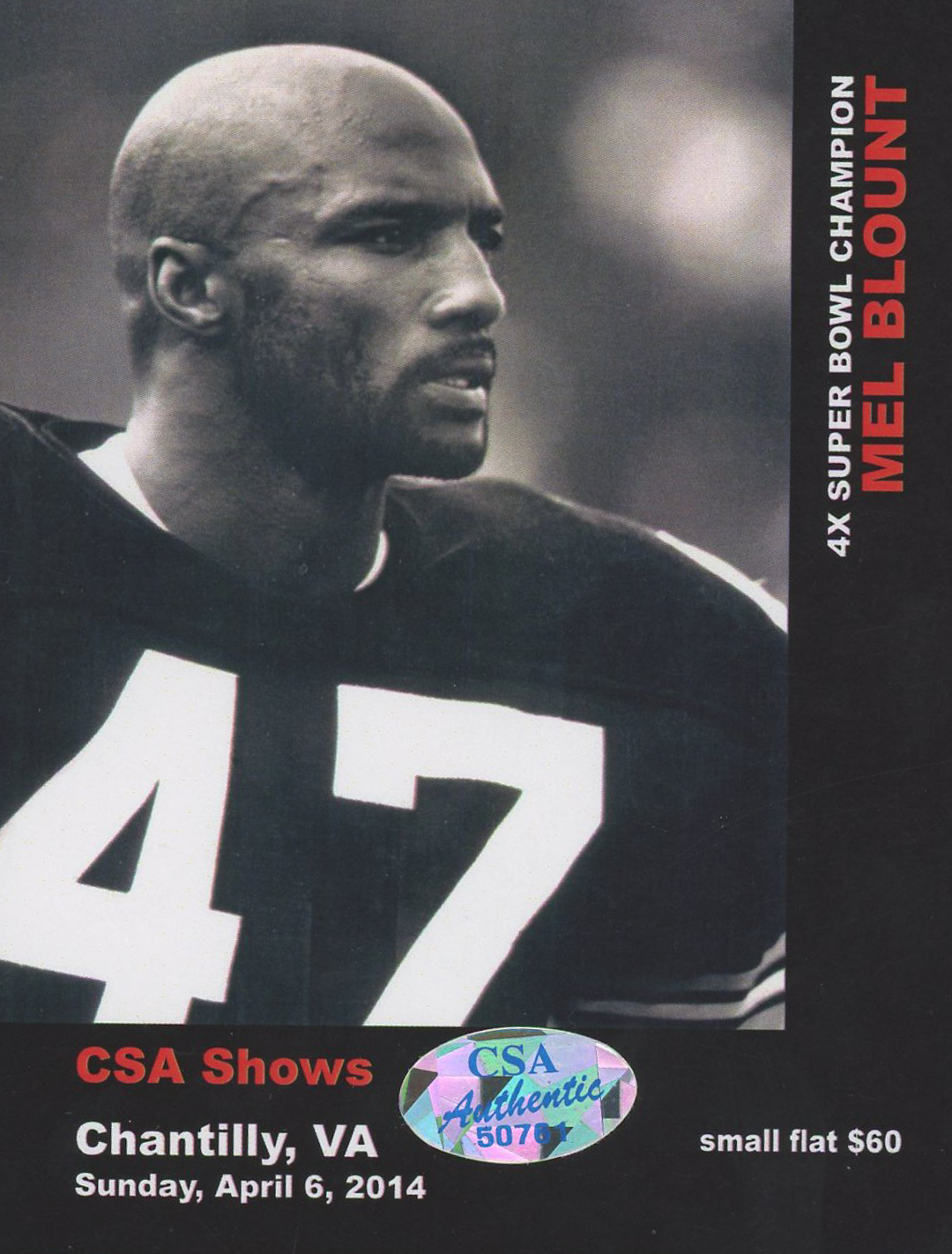 Photo measures 8" x 10" in size and has been hand signed in blue felt-tip pen by Mel Blount (HOF).
