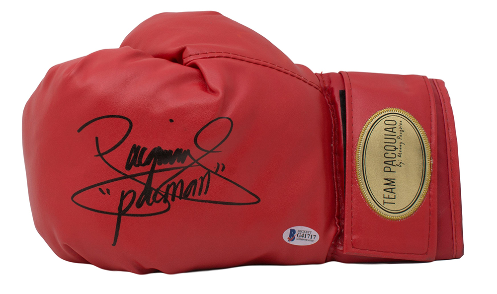 Team Pacquiao boxing glove. Hand-signed and inscribed in black felt-tip pen by Manny Pacquiao.