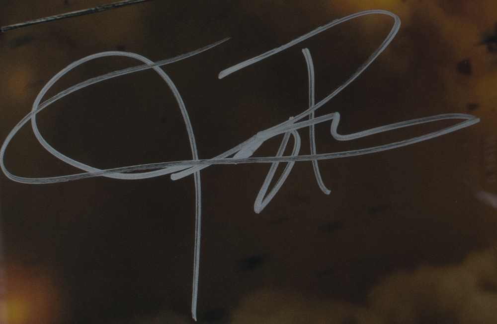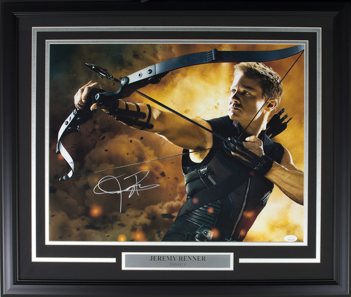 Custom frame measures 22" x 27" in size and features a photo that has been hand-signed in silver paint pen by Jeremy Renner (Hawkeye).
