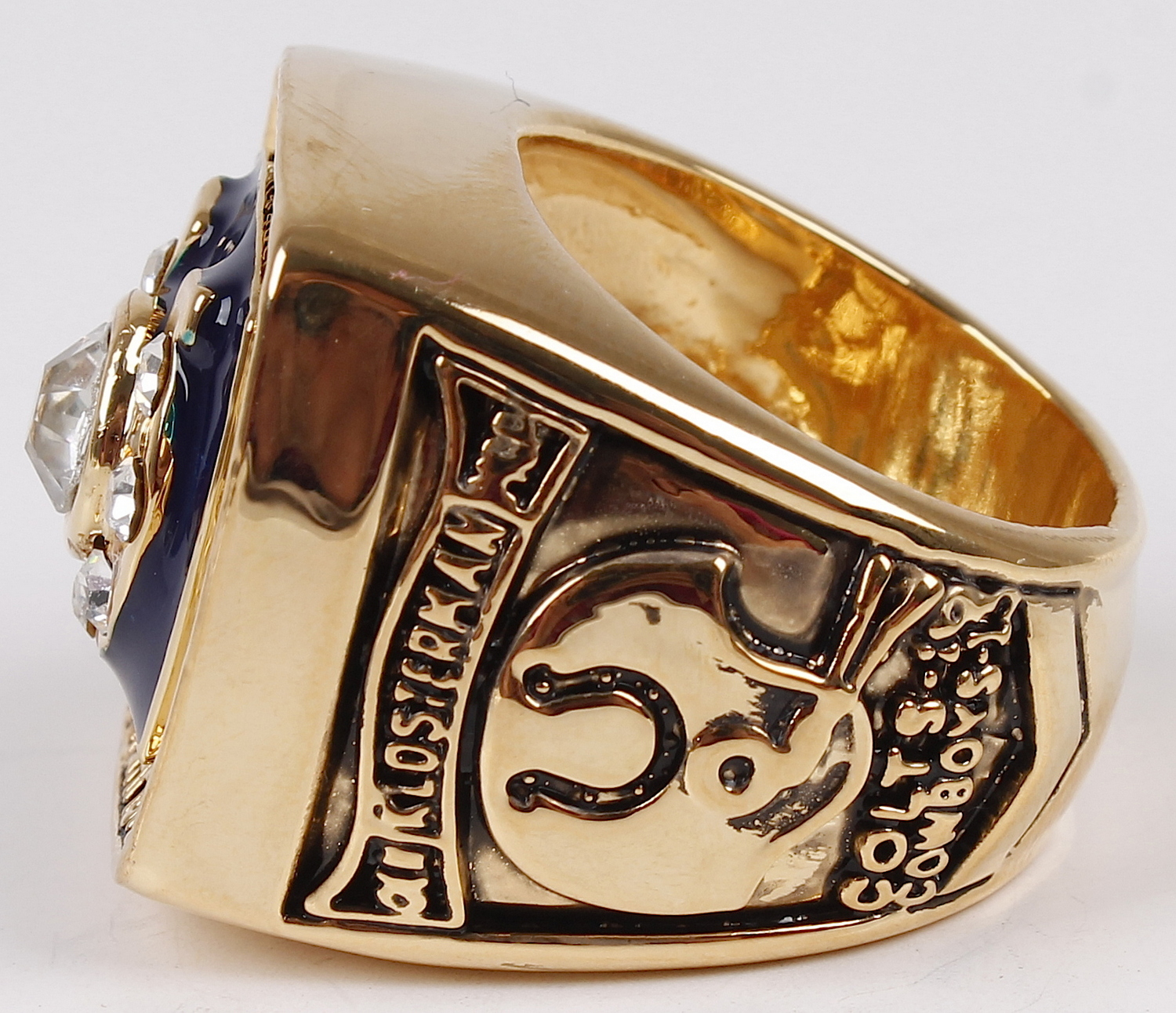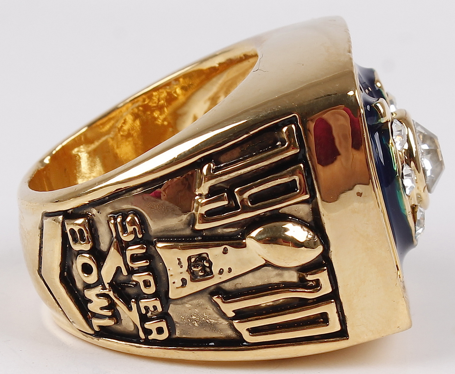 Baltimore Colts High Quality Replica 1970 Super Bowl V Ring. The ring has been hand crafted by professional jewelers. Made of metal alloy and clad with 18K Gold. Size 11.