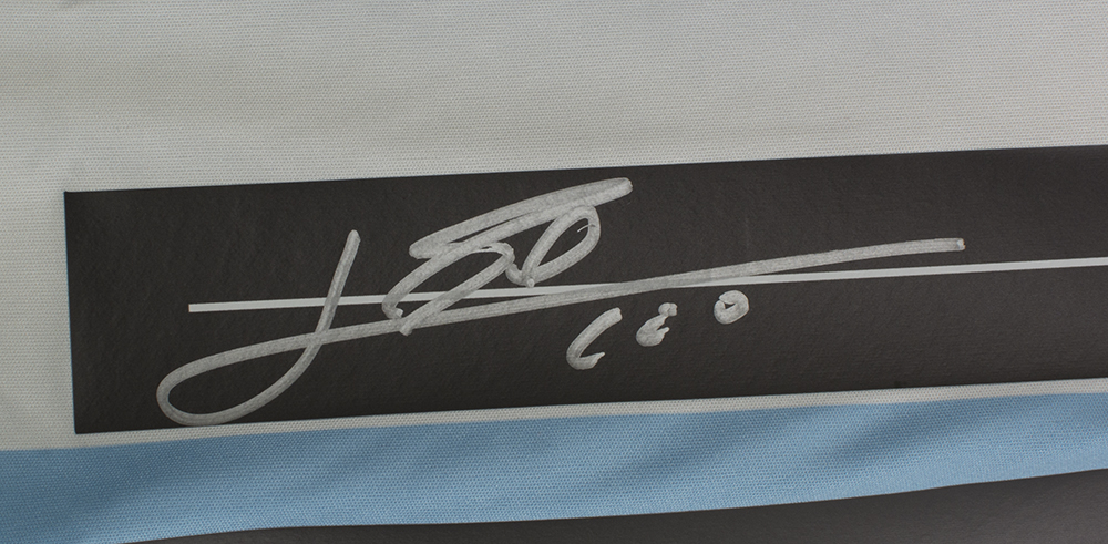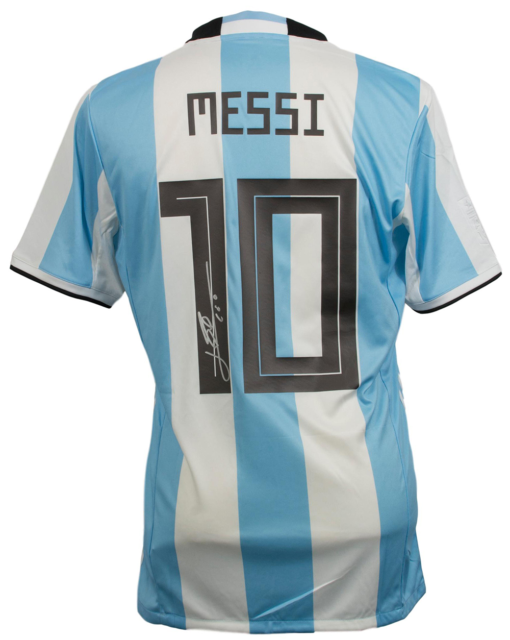 Adidas on-field style jersey with everything sewn on, size XL. Jersey has been hand-signed in silver paint pen by Lionel Messi.