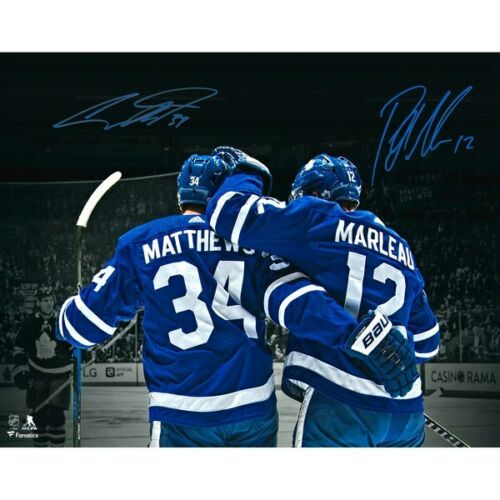 Photo measures 16" x 20" and has been hand-signed in blue paint pen by Auston Matthews and Patrick Marleau.
