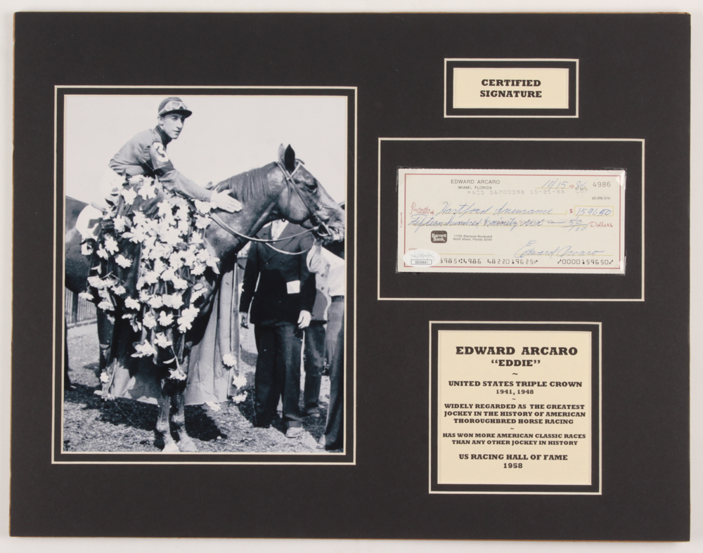 Custom matted display measures approximately 14" x 18" in size and features a personal bank check, dated October 15, 1986, that has been hand-signed in blue ink pen by Eddie Arcaro (D. 1997, HOF). Also includes an 8" x 10" photo.