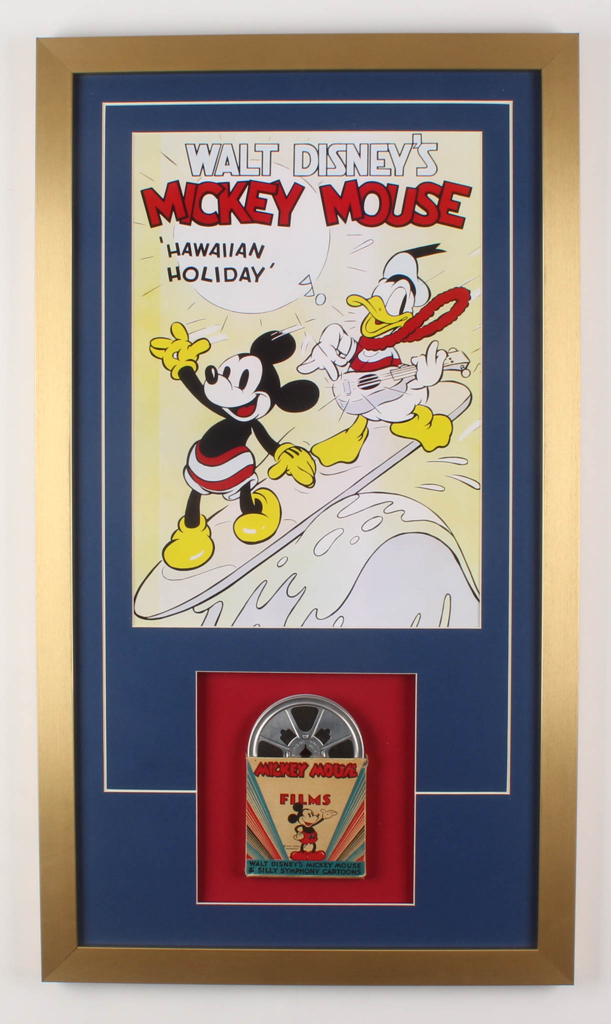 Custom frame measures 17" x 30" in size and features a vintage 8mm "Mickey Mouse Films" film reel. Display also features a Disney print. Please see photos for more information.