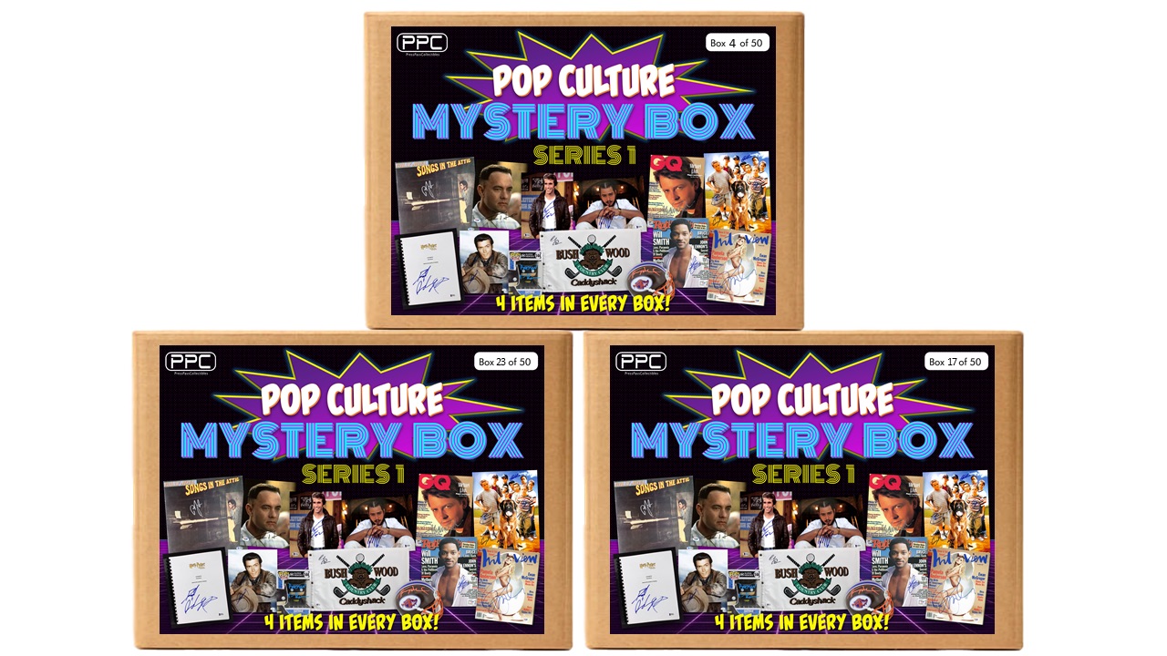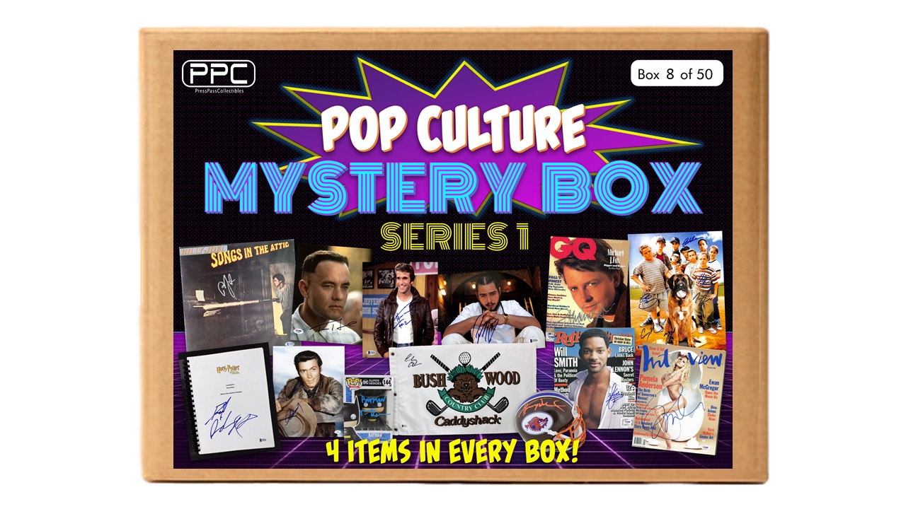 The Press Pass Collectibles Pop Culture Mystery Box includes four (4) items in each box. Two (2) items will be autographed 8x10’s, one (1) item be an unsigned Funko POP! from the DC Universe, and the last item will be one (1) autographed 3D item. This could include autographed movie scripts, magazines, books, vinyl albums, masks, and other movie memorabilia of all kinds!